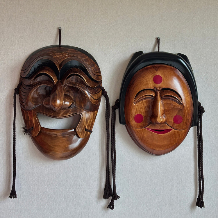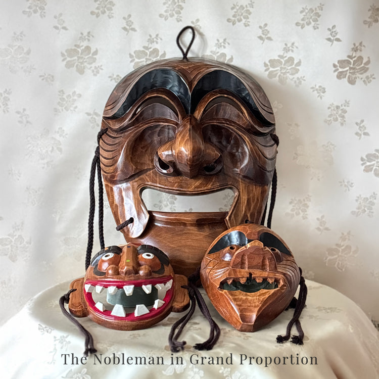 This grand-scale handcrafted mask set unites two of the most iconic characters from Korea’s traditional Hahoe mask theatre—the Nobleman (Yangban) and the Bu-Nae. Together, they embody the dual essence of human expression: satire and allure, mockery and charm.