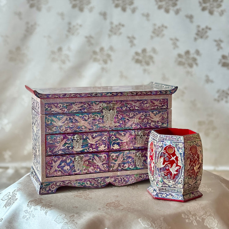 Mother of Pearl Jewelry Chest Set: Matching Pencil Holder with Pine and Crane Motif