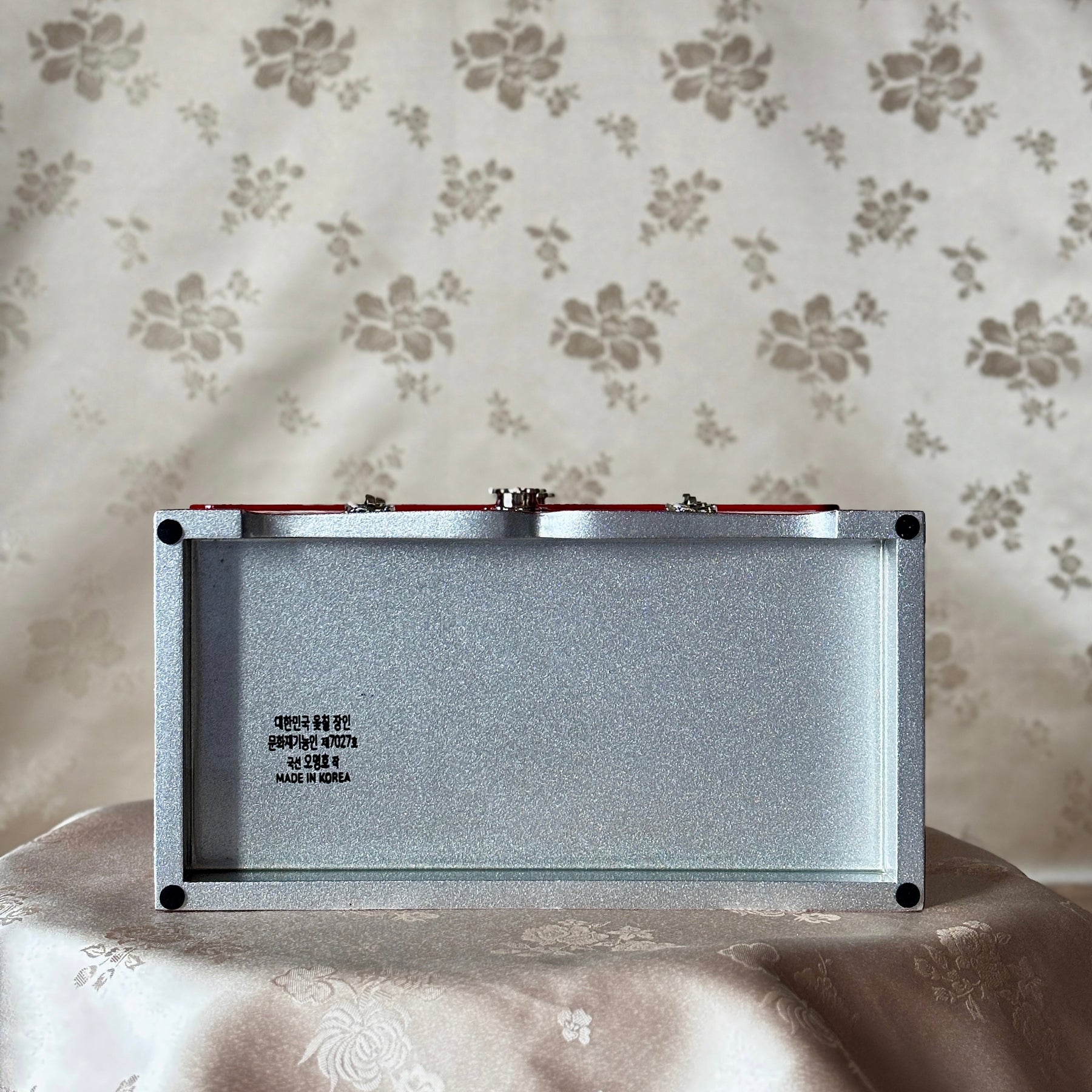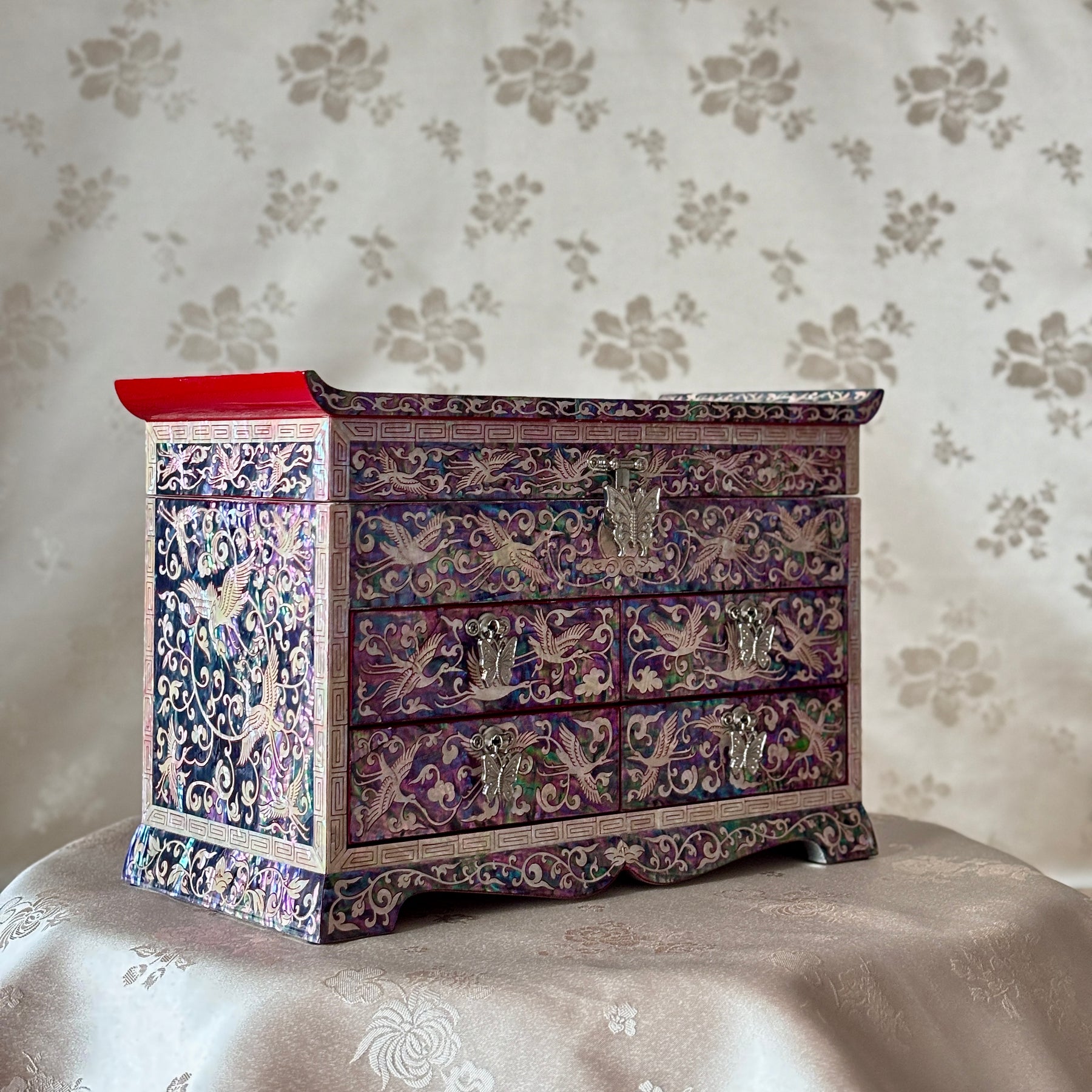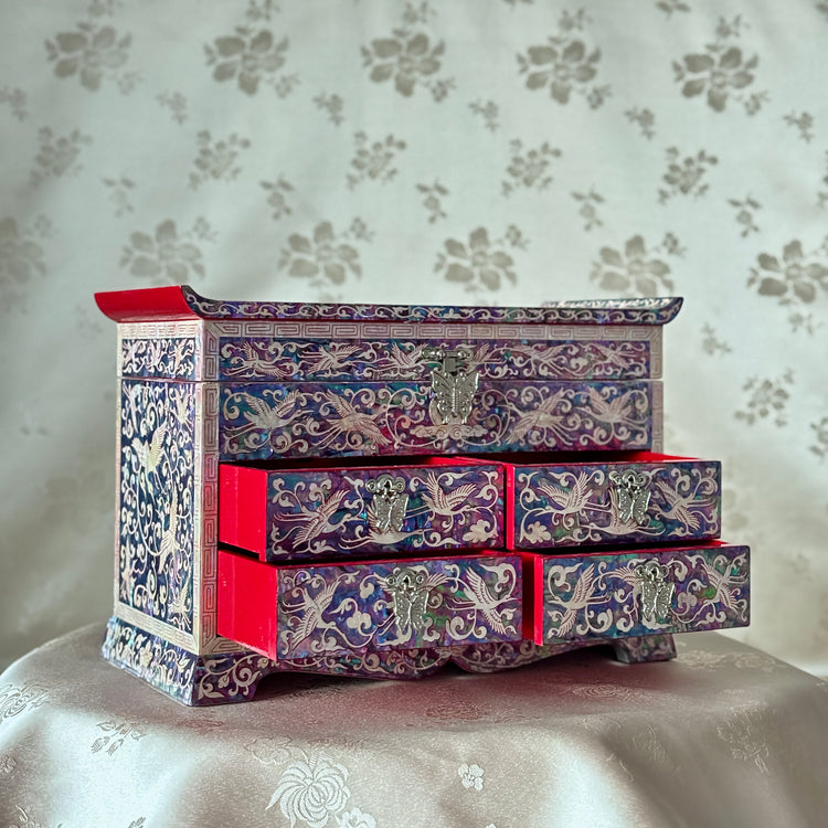 Across the front and side panels, two distinct shell types are employed: one forming a dense, iridescent ground, the other defining cranes and scrolling vine patterns (dangcho). The result is so richly layered that the underlying red surface almost disappears, transforming the body of the chest into a continuous field of movement and light. By contrast, the rear panel is deliberately restrained: cranes and pine branches appear with measured spacing, allowing the principle of yeobaek—the beauty of meaningful emptiness—to emerge and offer visual repose.
