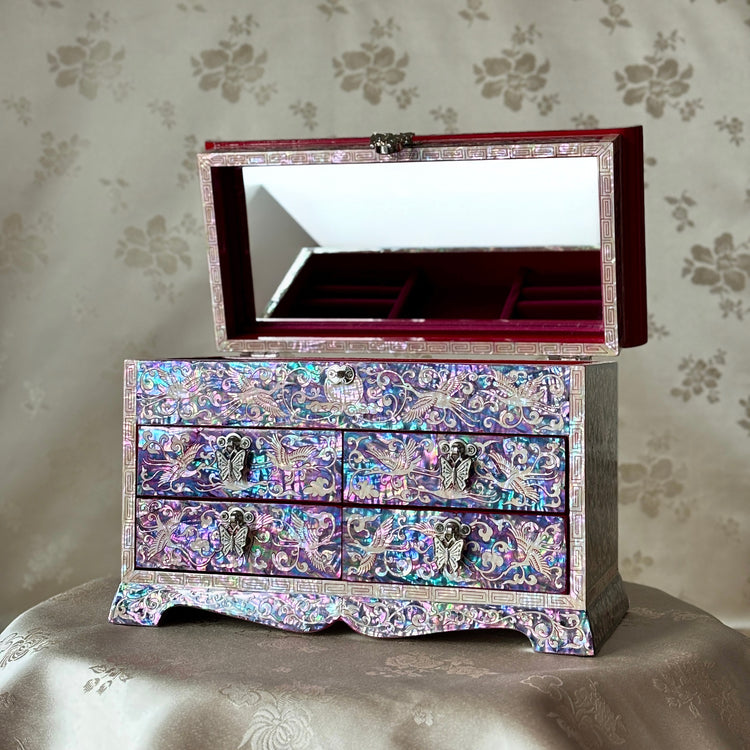 Function is integrated without compromise. Four drawers provide measured storage for jewellery, while the interior lid reveals a mirror for moments of quiet preparation. Red velvet lining offers both protection and display for rings and earrings. Even the underside of the lid’s edge is finished with shellwork—an almost private gesture of craftsmanship that reveals itself only through use.