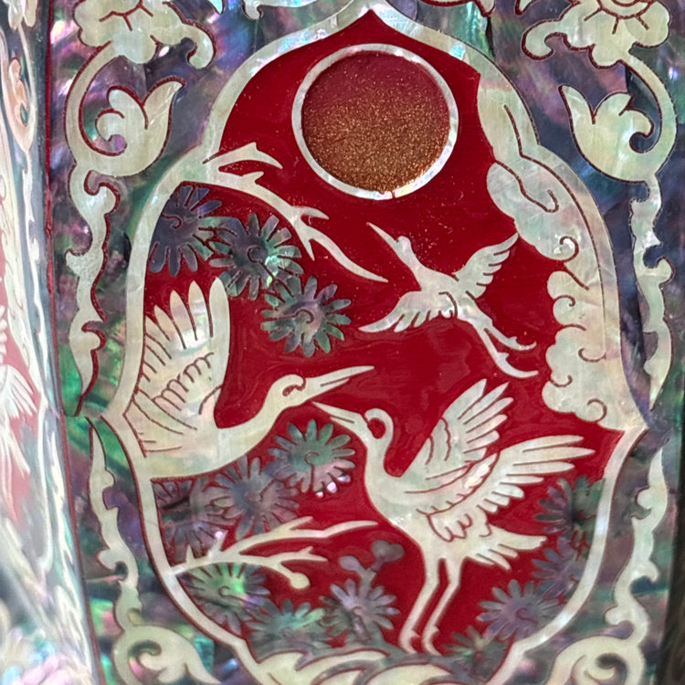 The accompanying pencil holder, formed as a hexagon rather than a conventional rectangle, extends this language of refinement. Its faceted body enhances the play of light across the shell surface and demands even greater technical finesse along the curved planes. Each face is framed like a miniature painting, within which cranes, pine, and the sun are arranged in poised harmony. Varied shell selections heighten contrast, lending the object a visual richness that rewards close proximity rather than immediate impact.