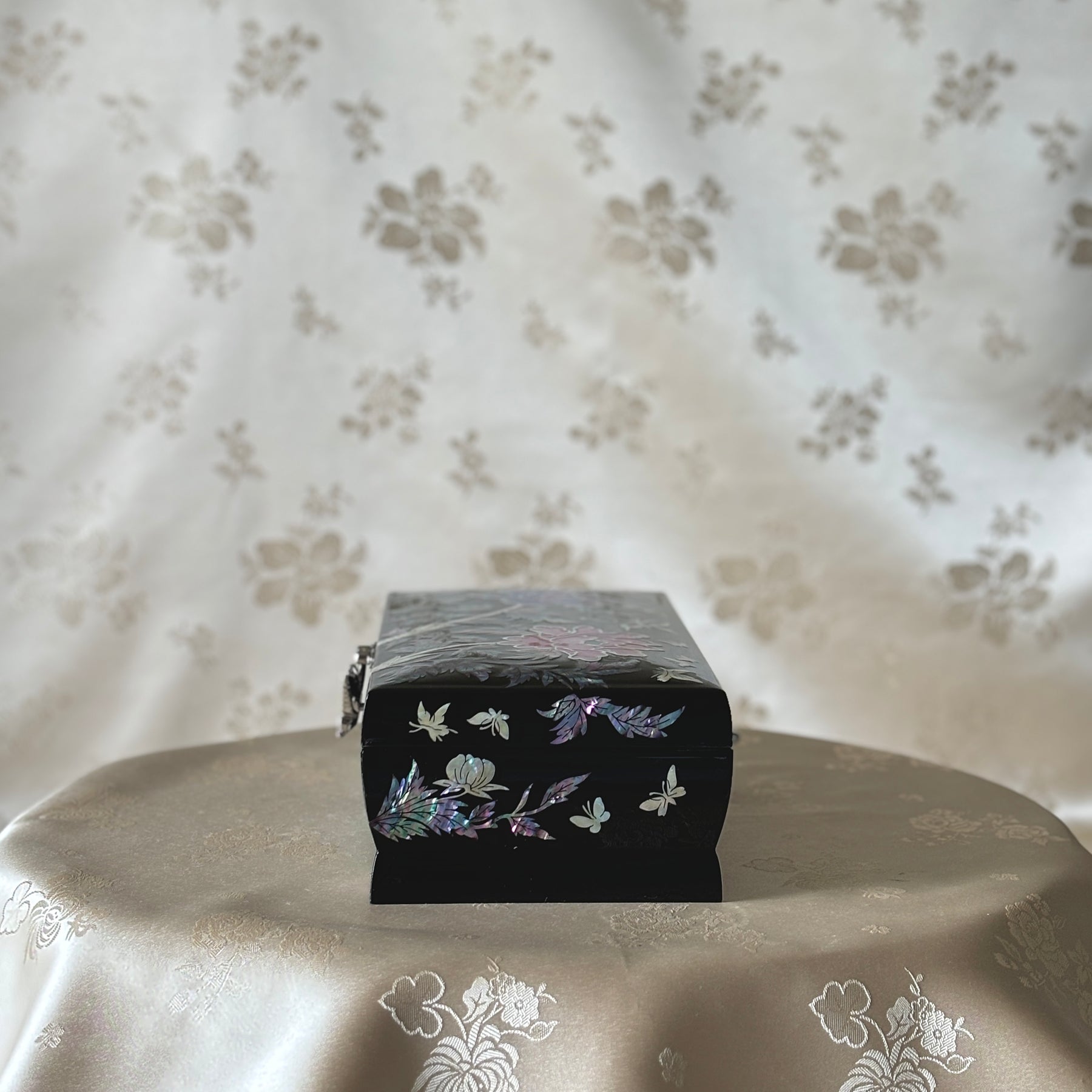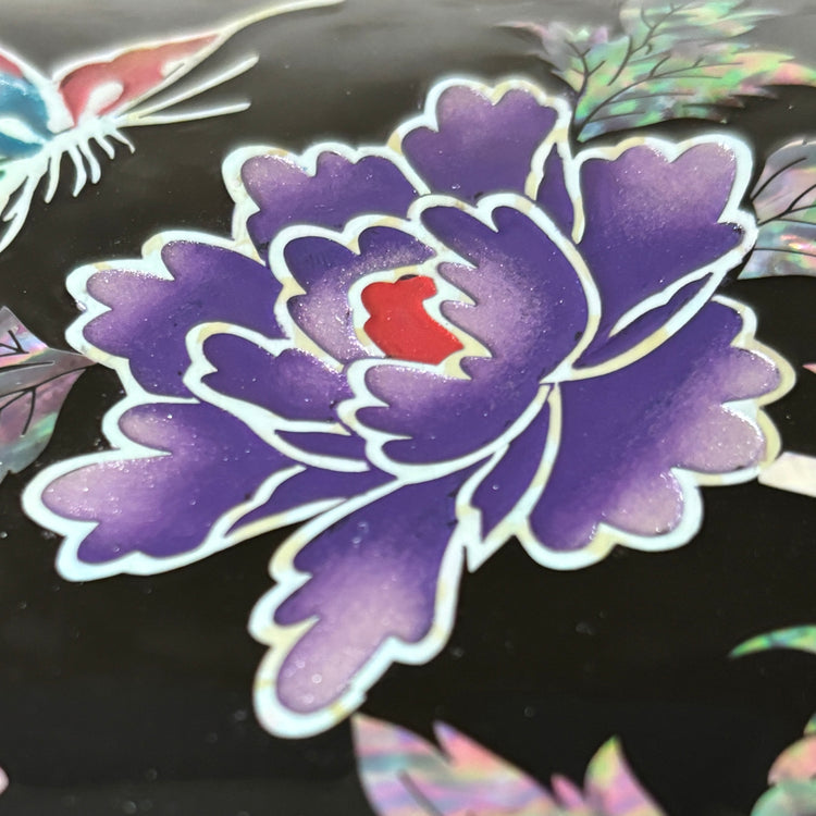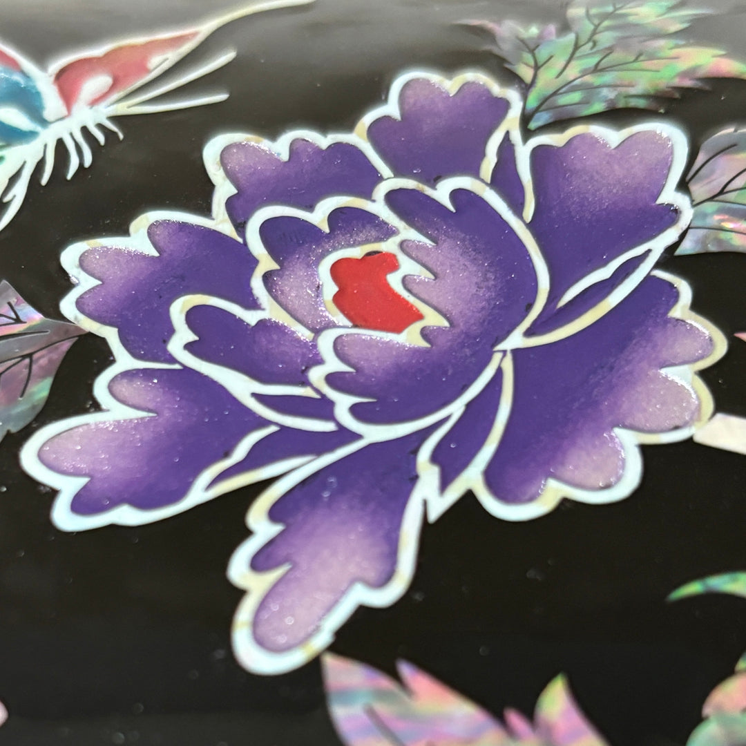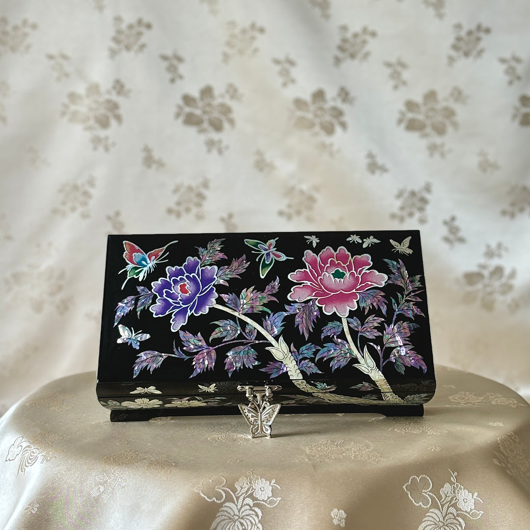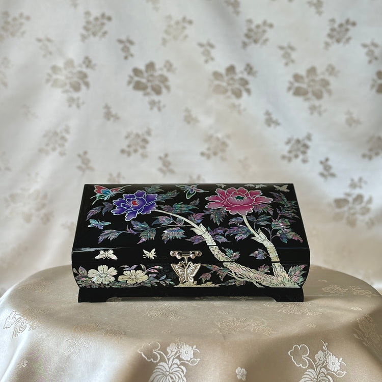 This exquisite box is adorned with intricate mother of pearl butterflies and peony patterns that dance together in perfect harmony. Each reflection of the mother of pearl changes with the angle, light, and time, making it look new every time you see it.