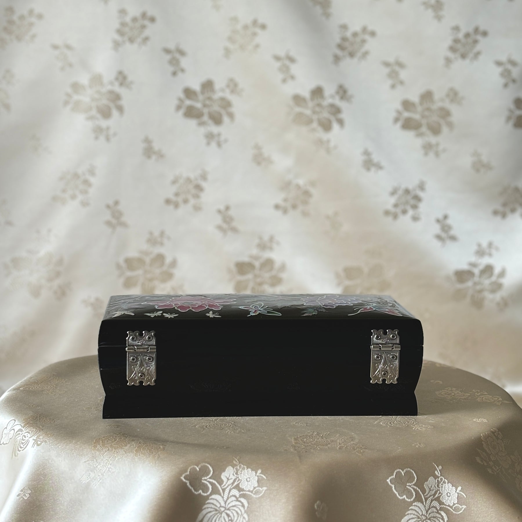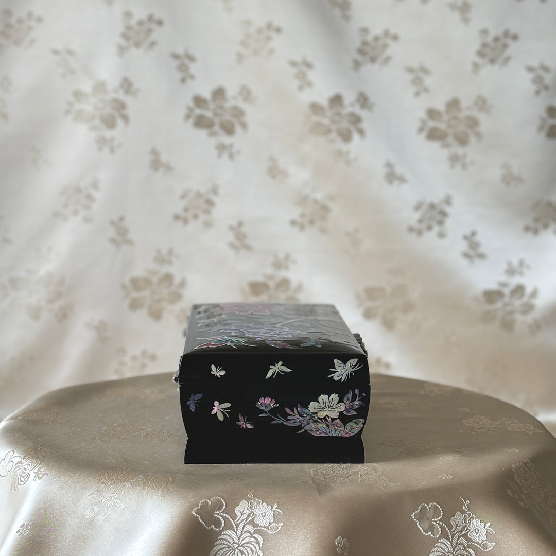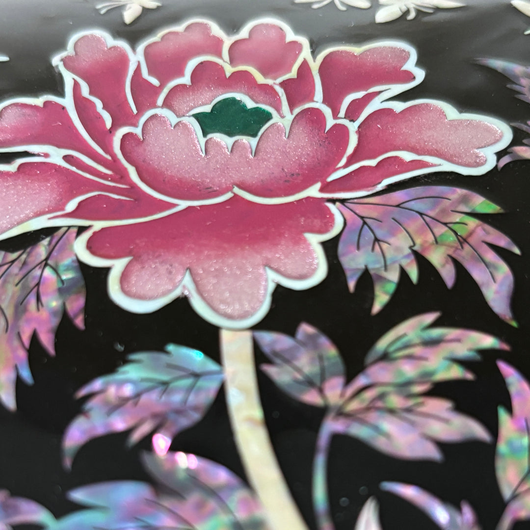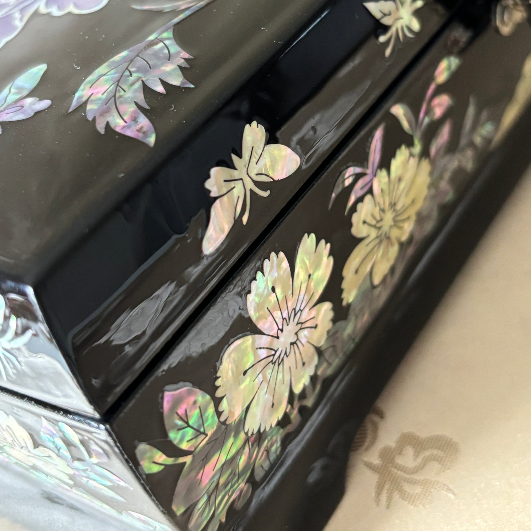 This exquisite box is adorned with intricate mother of pearl butterflies and peony patterns that dance together in perfect harmony. Each reflection of the mother of pearl changes with the angle, light, and time, making it look new every time you see it.