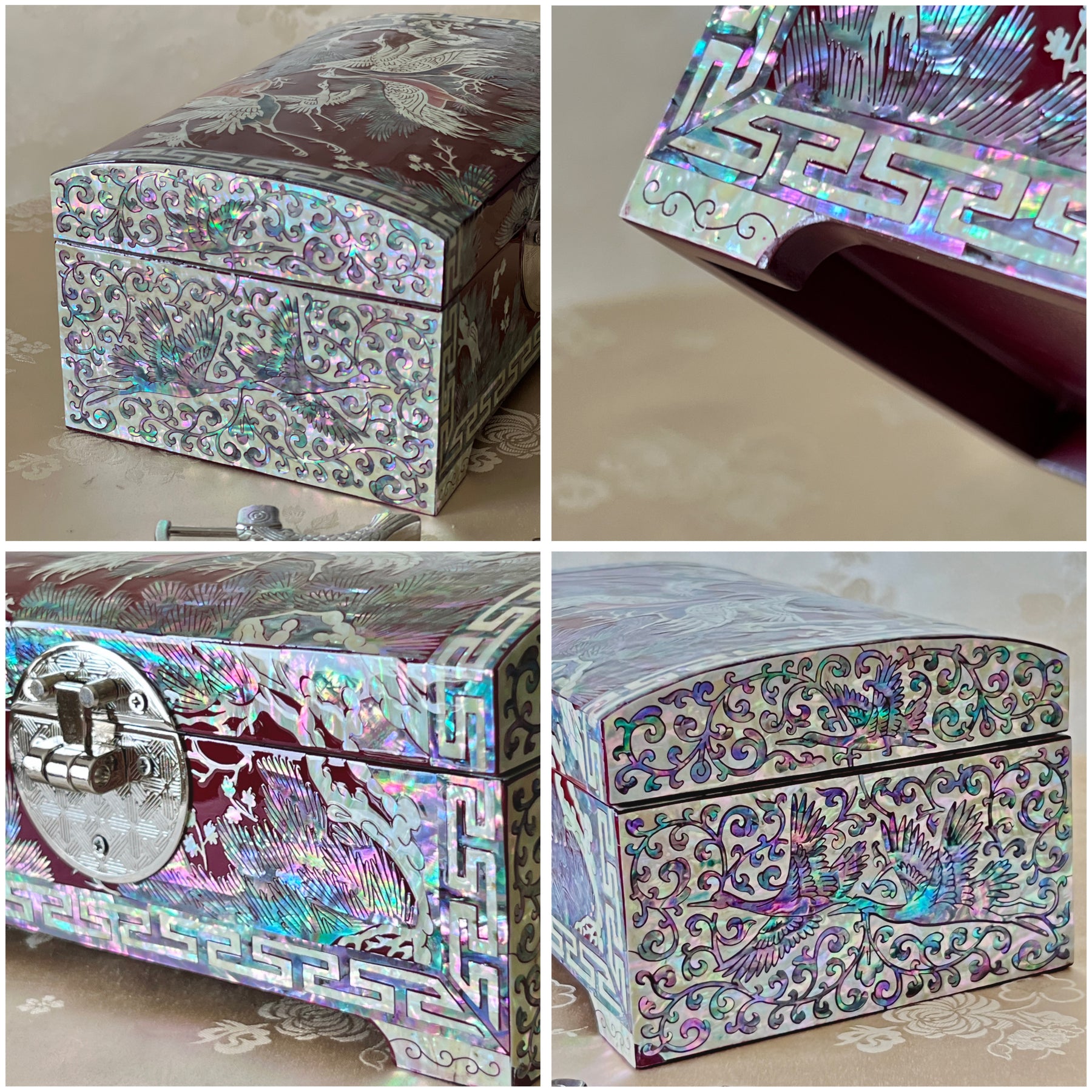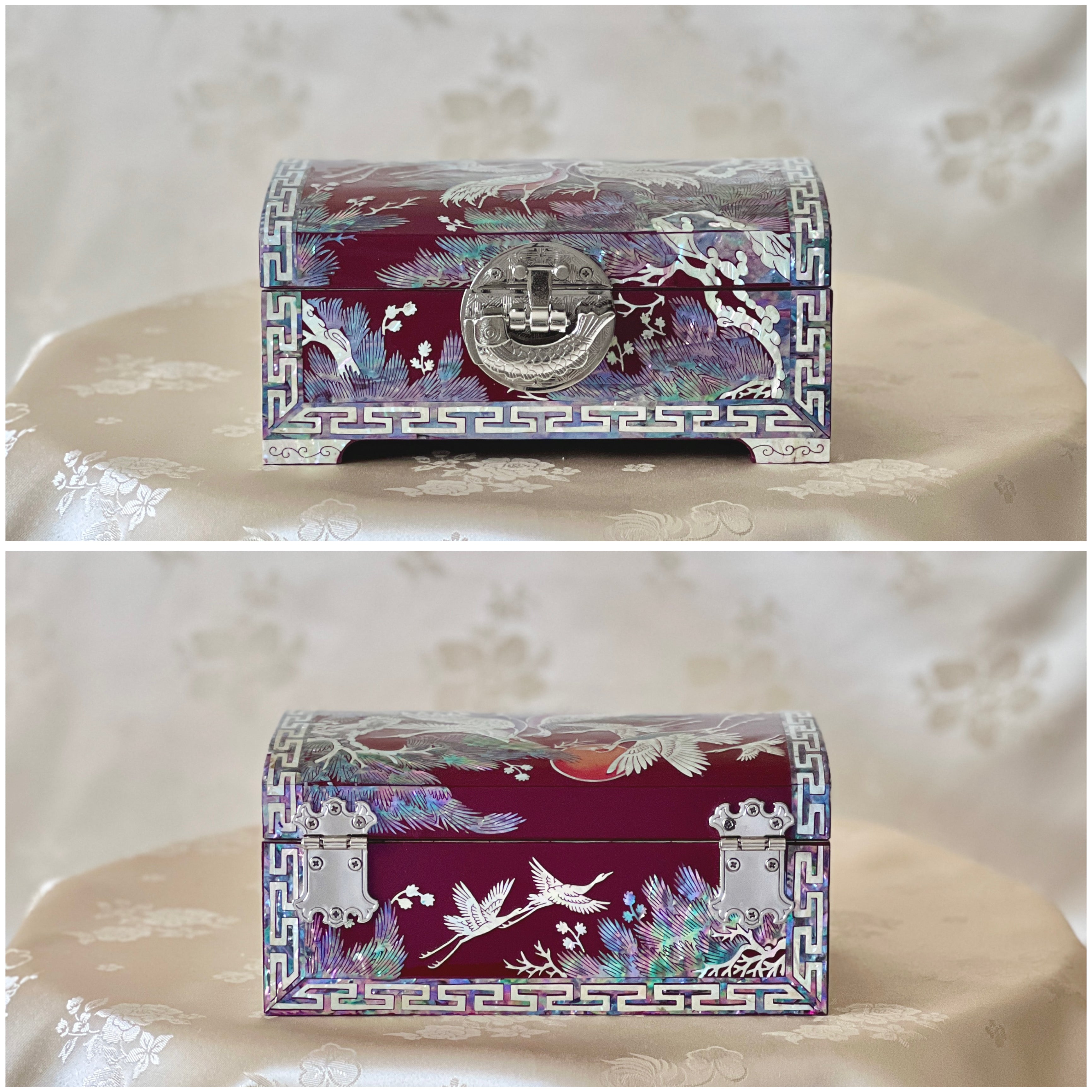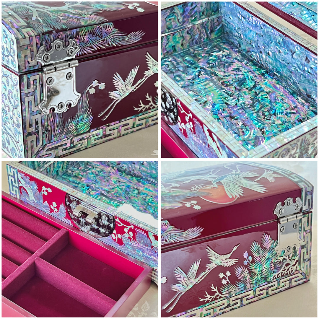 This exquisite Korean Handmade Mother of Pearl Wooden Jewelry Box (자개 송학문 해적 보석함) is perfect for keeping your valuable items, from small rings to large necklaces.