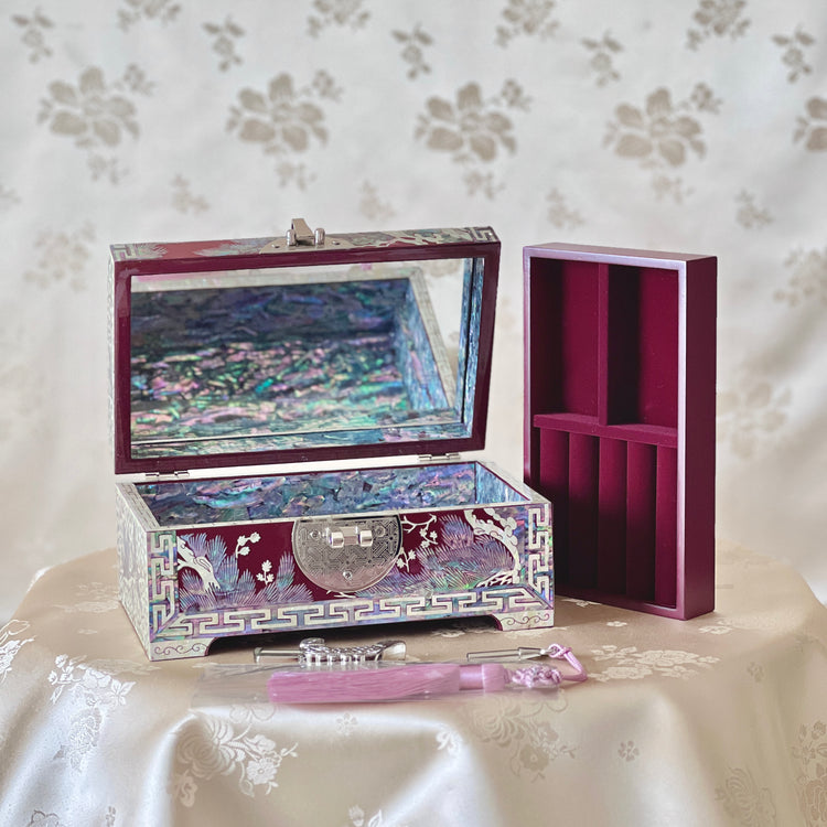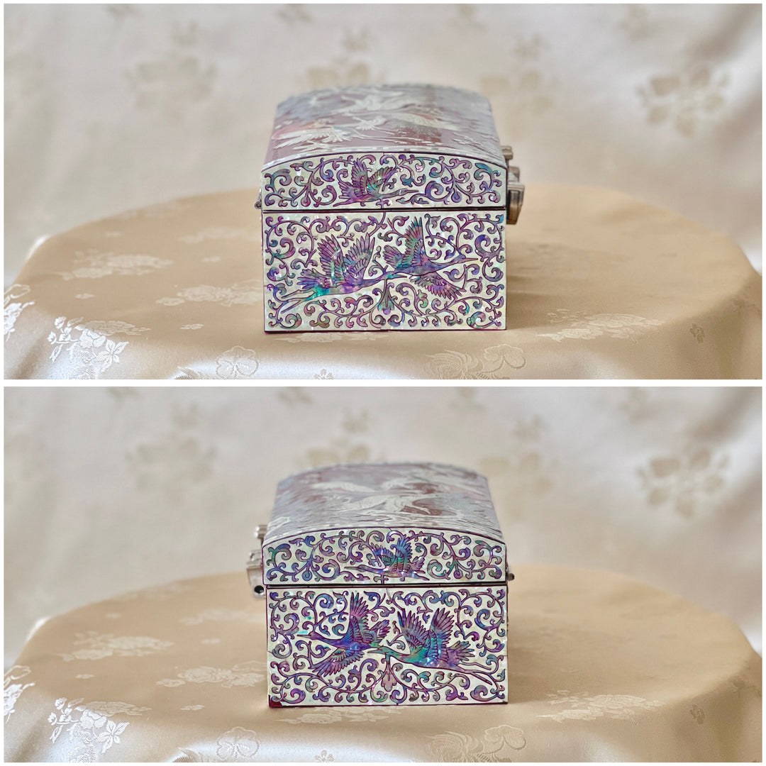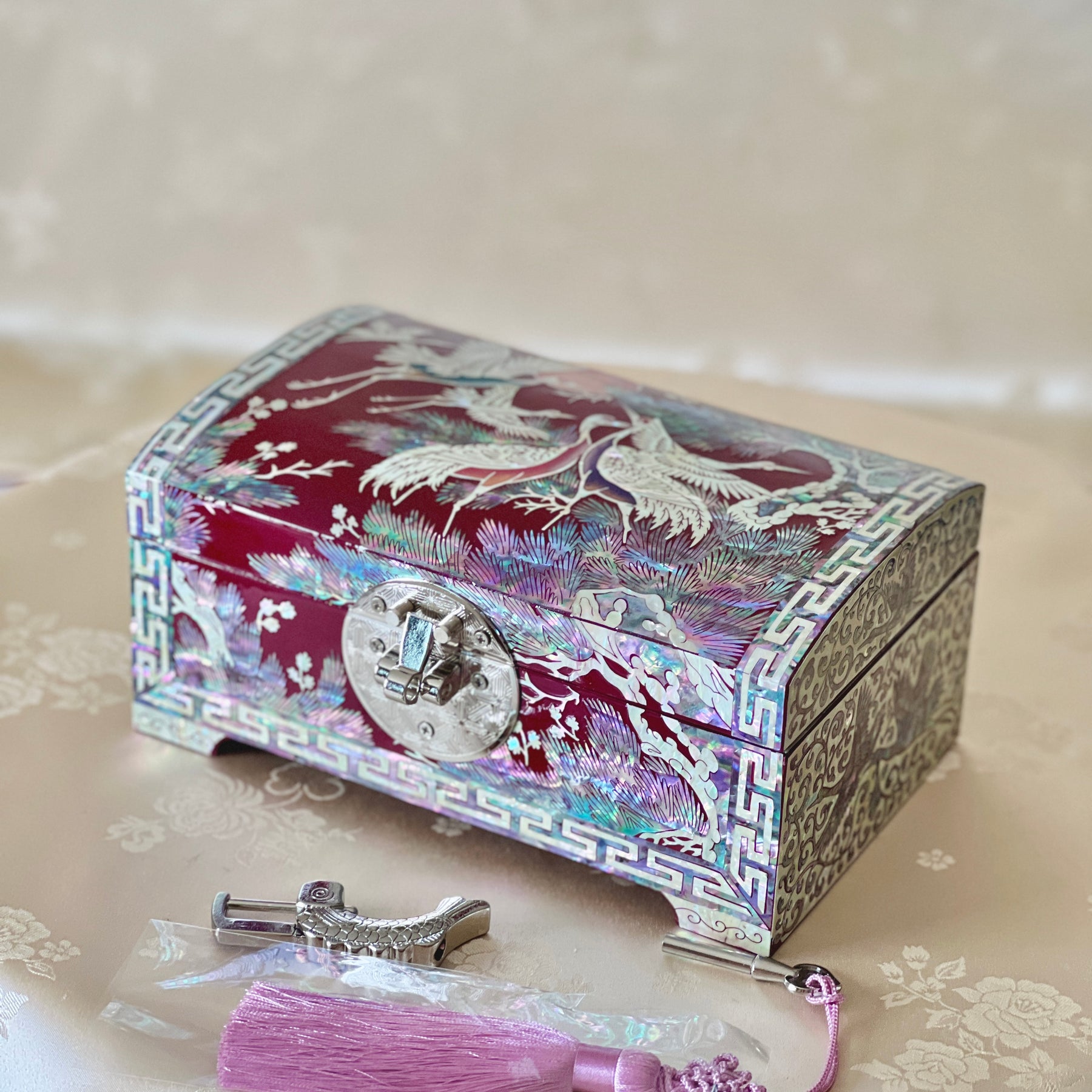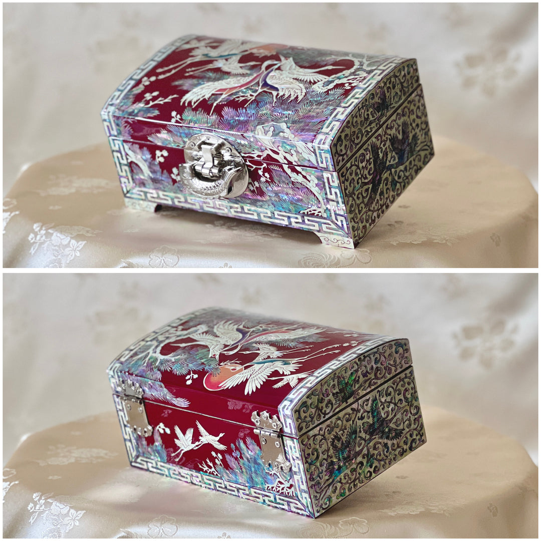 This exquisite Korean Handmade Mother of Pearl Wooden Jewelry Box (자개 송학문 해적 보석함) is perfect for keeping your valuable items, from small rings to large necklaces.