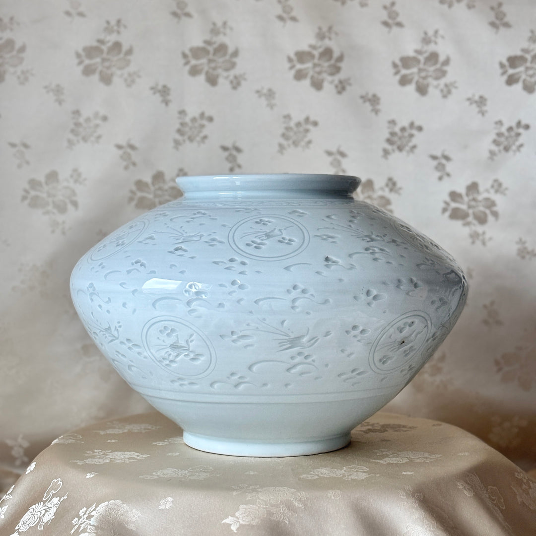 This stunning White Porcelain Vase with Incised Cloud and Crane Motif (백자 음각 운학문 호) is a timeless example of refined Korean ceramic artistry. With its wide, graceful silhouette and soft white hue, this vase serves as a quiet but commanding focal point in any space. The detailed incised patterns of cranes flying amidst clouds create a delicate sense of movement, reminiscent of serene winter landscapes or the lightness of a bird soaring in the sky.