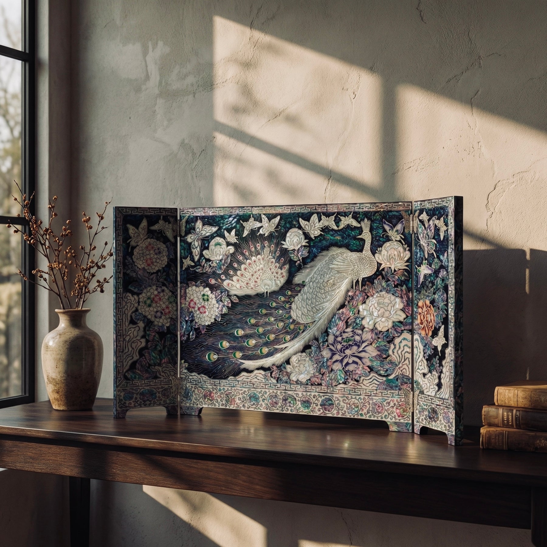 このエレガントな折りたたみ式スクリーンをリビングルームや書斎のテーブルの上に置いて、その精巧なデザインを間近で鑑賞する様子を想像してみてください。一日を通して光が変化すると、螺鈿細工の象嵌が光を捉えて反射し、孔雀が生き生きと浮かび上がります。このスクリーンは美しい焦点となるだけでなく、会話のきっかけにもなり、洗練されたセンスと韓国の芸術性への感謝の象徴にもなります。ゲストをもてなすときも、自宅で静かなひとときを楽しむときも、この作品は空間に紛れもない贅沢感と文化的遺産を加えてくれます。