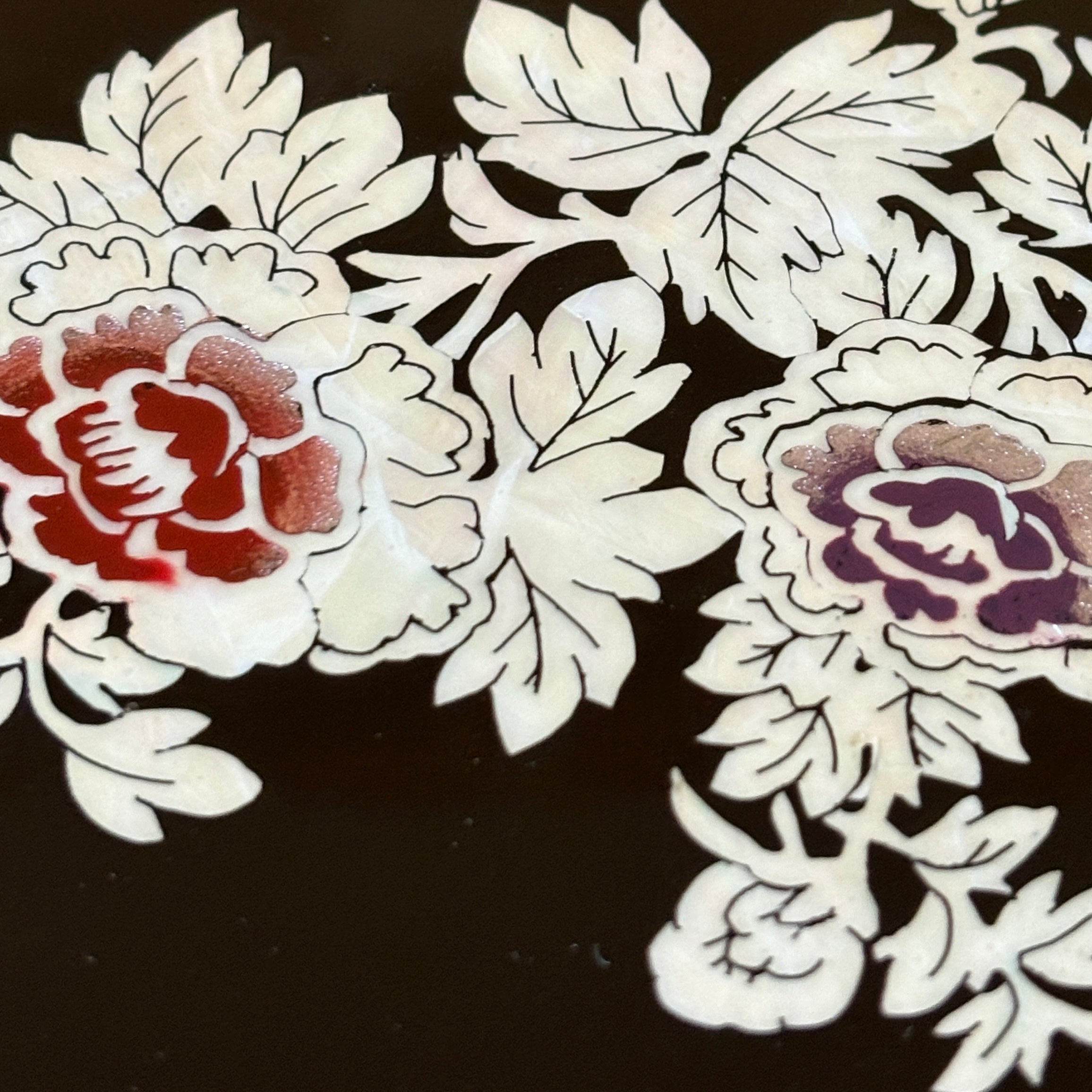 螺鈿ワイン色孔雀牡丹文様木皿 (자개 목단 공작문 접시)