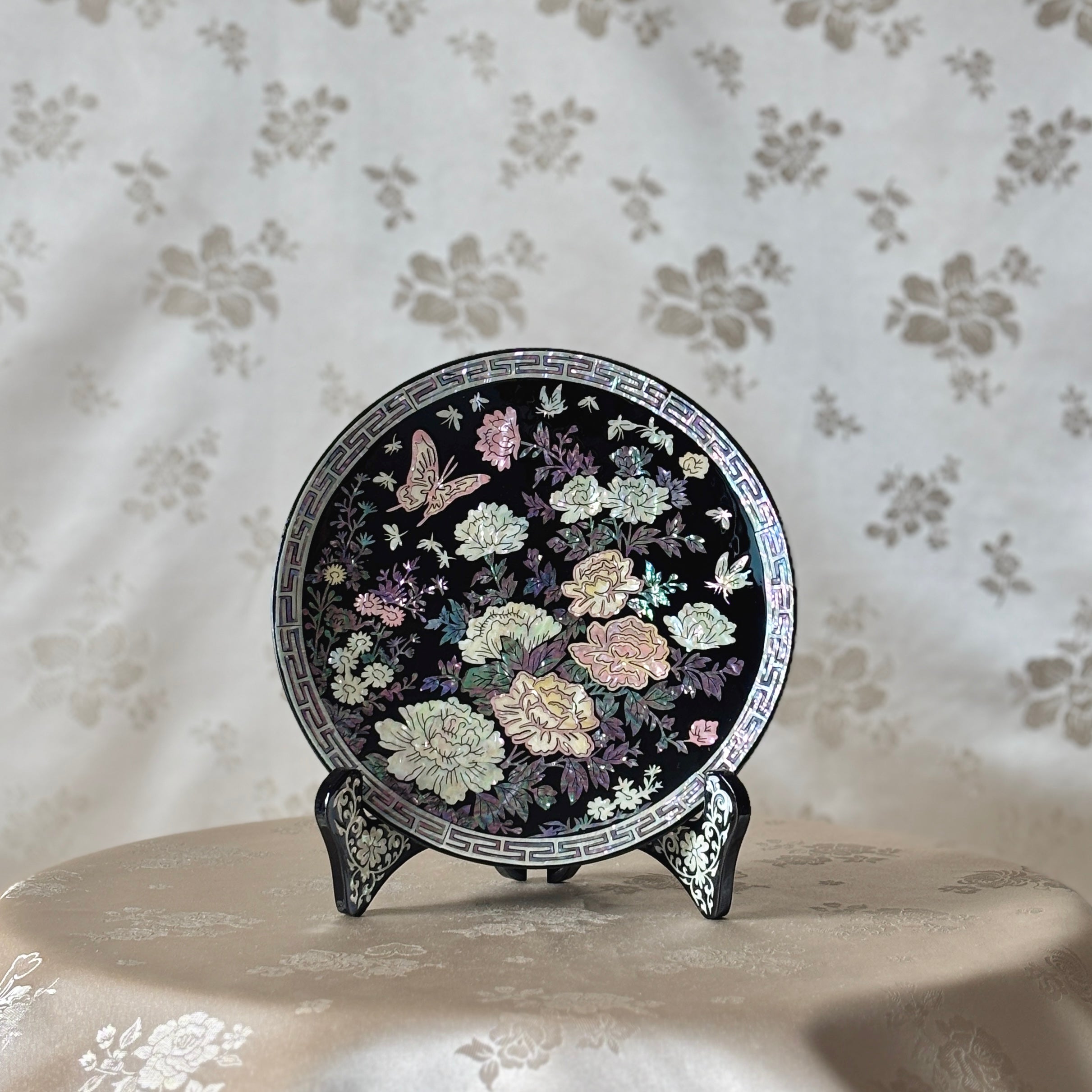Mother of Pearl Decorative Plate with Peony and Butterfly Design