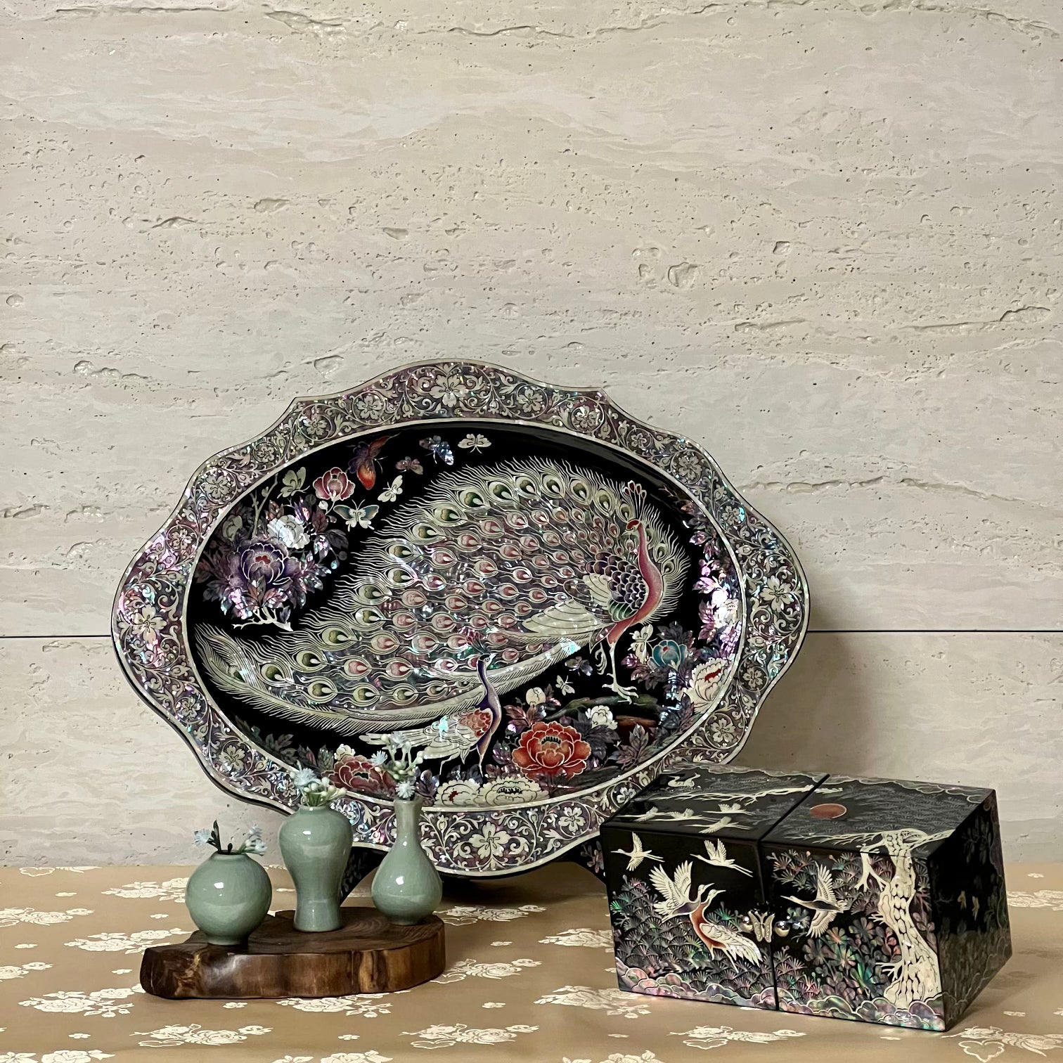 マザーオブパール孔雀プレートと鶴のジュエリーボックスのセット、青磁ミニ花瓶のギフト付き