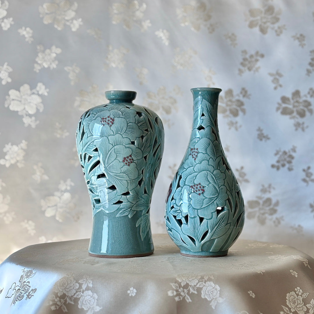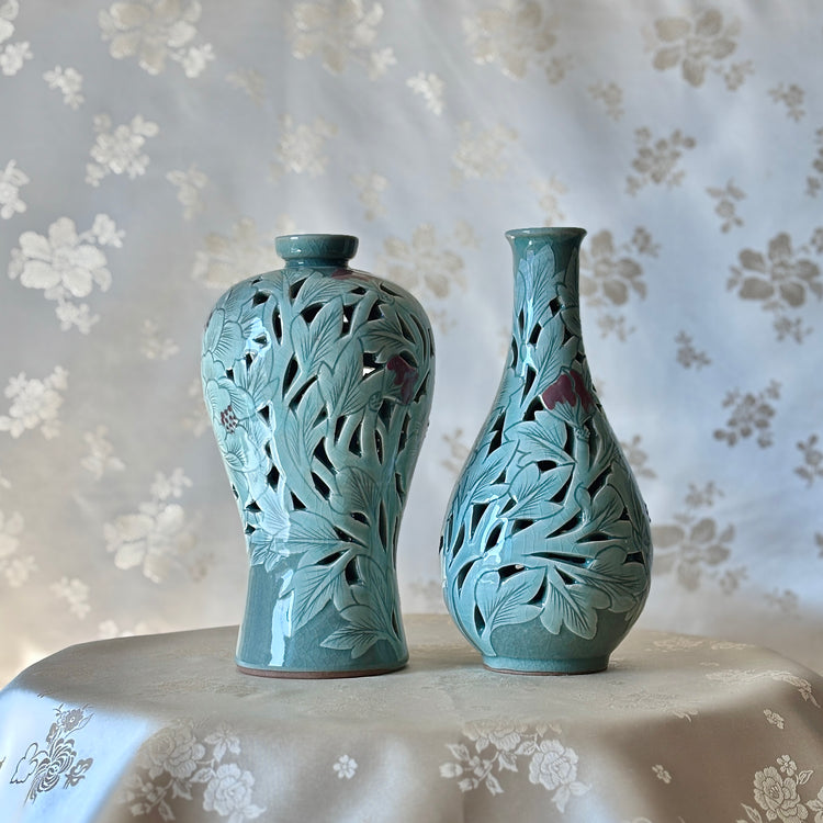 青磁花瓶セット:白い象嵌と牡丹のモチーフを施した精巧な透かし細工