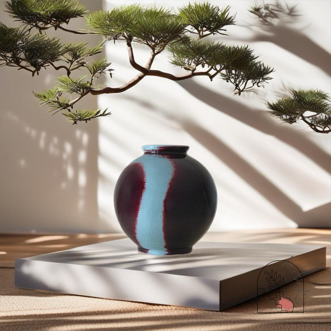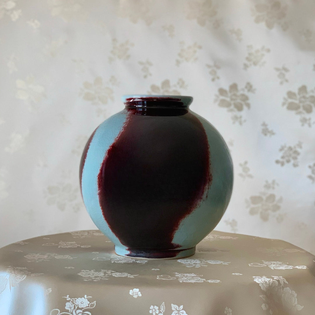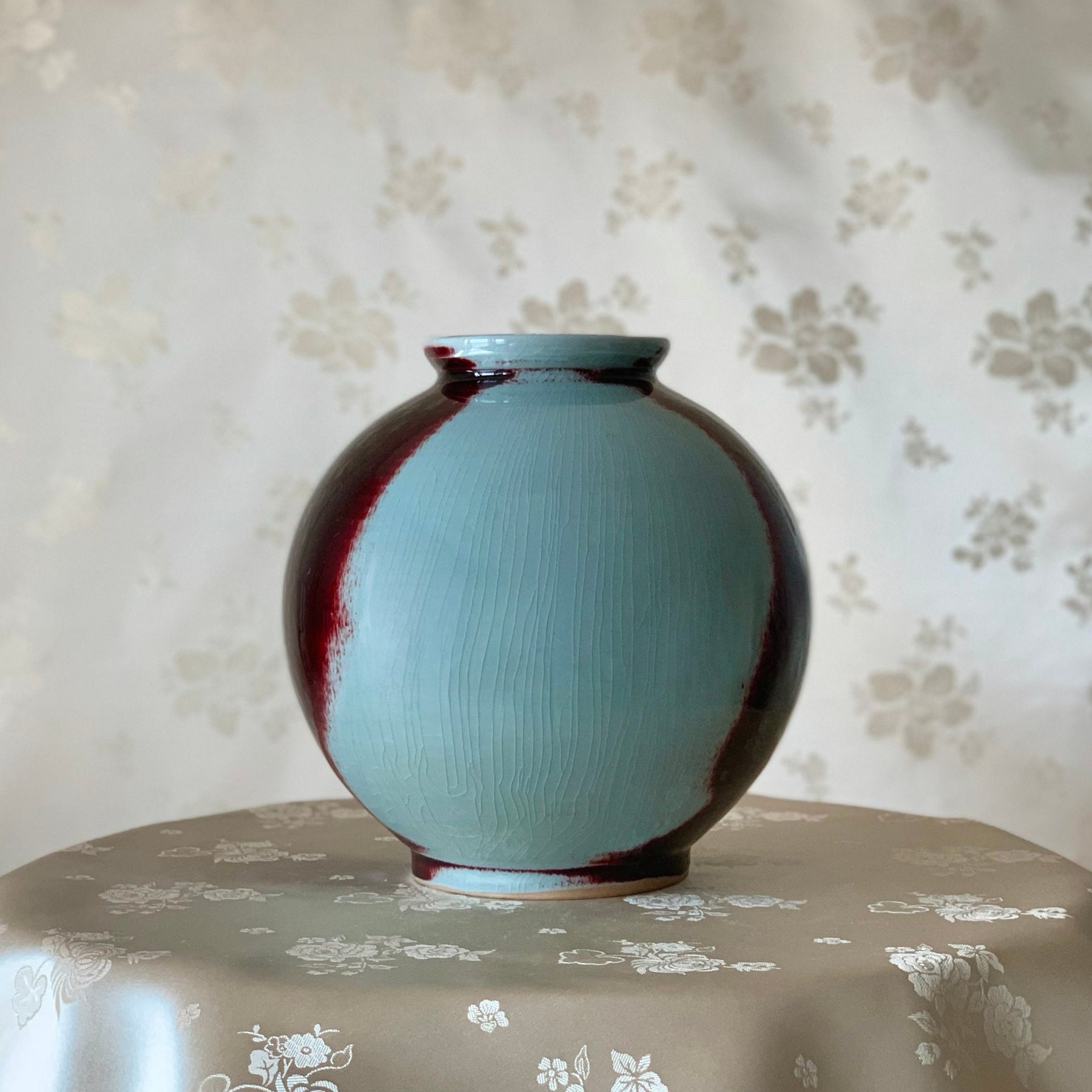 ユニークな韓国の手作り銅釉磁器花瓶 (동화 요변 호) をご覧ください。他の陶器とは異なり、デザインは窯の熱によって作られるため、各作品は特別です。赤と緑の美しい組み合わせは、火が銅釉にどのように触れるかによって異なります。大切な人への特別な贈り物になります。