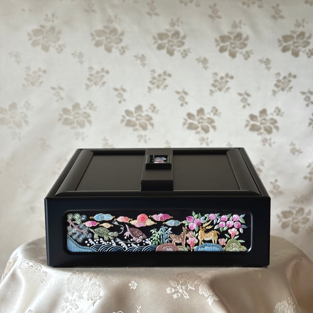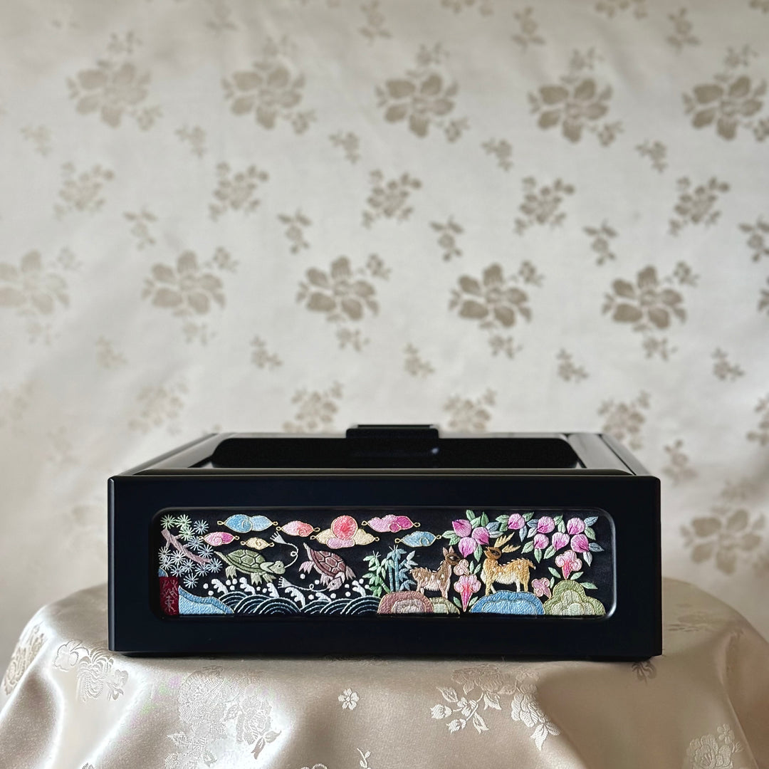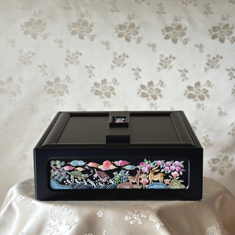 長寿のシンボルで飾られた箱の各面には、鹿、亀、松、太陽など時代を超えたモチーフを描いた精巧な刺繍が施されています。韓国文化に深く根付いたこれらのシンボルは、永続的な健康、幸福、繁栄への願いを伝えます。