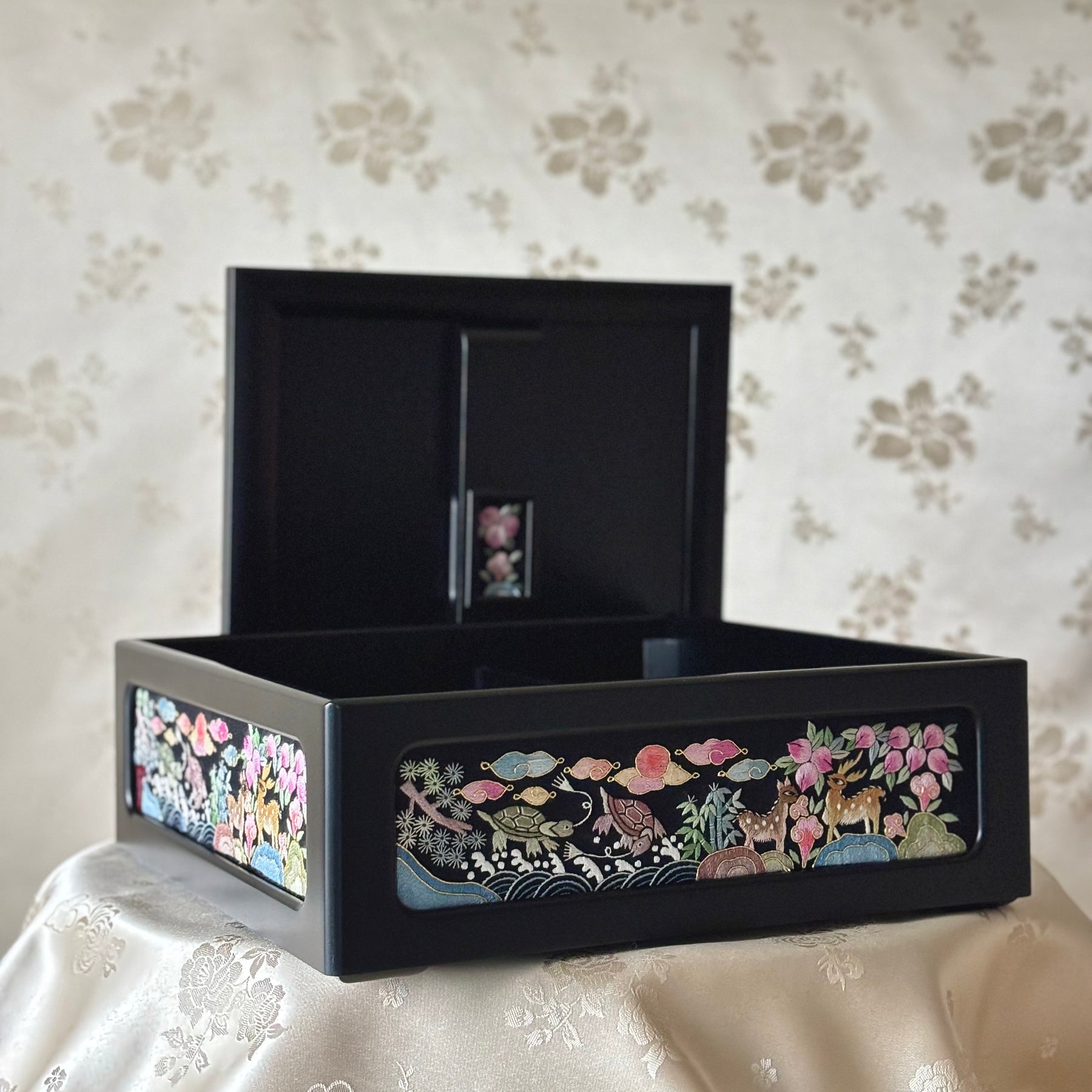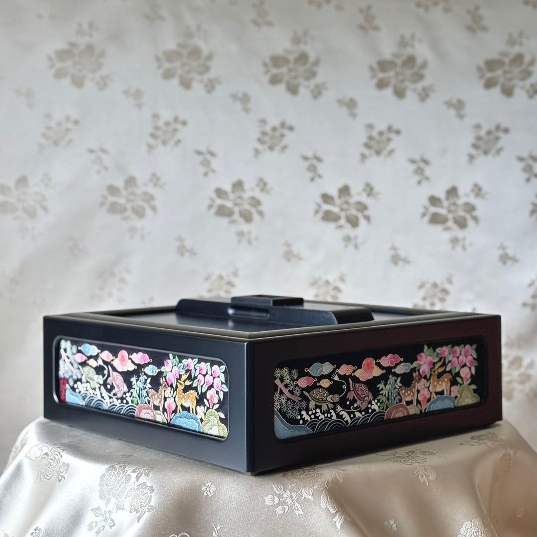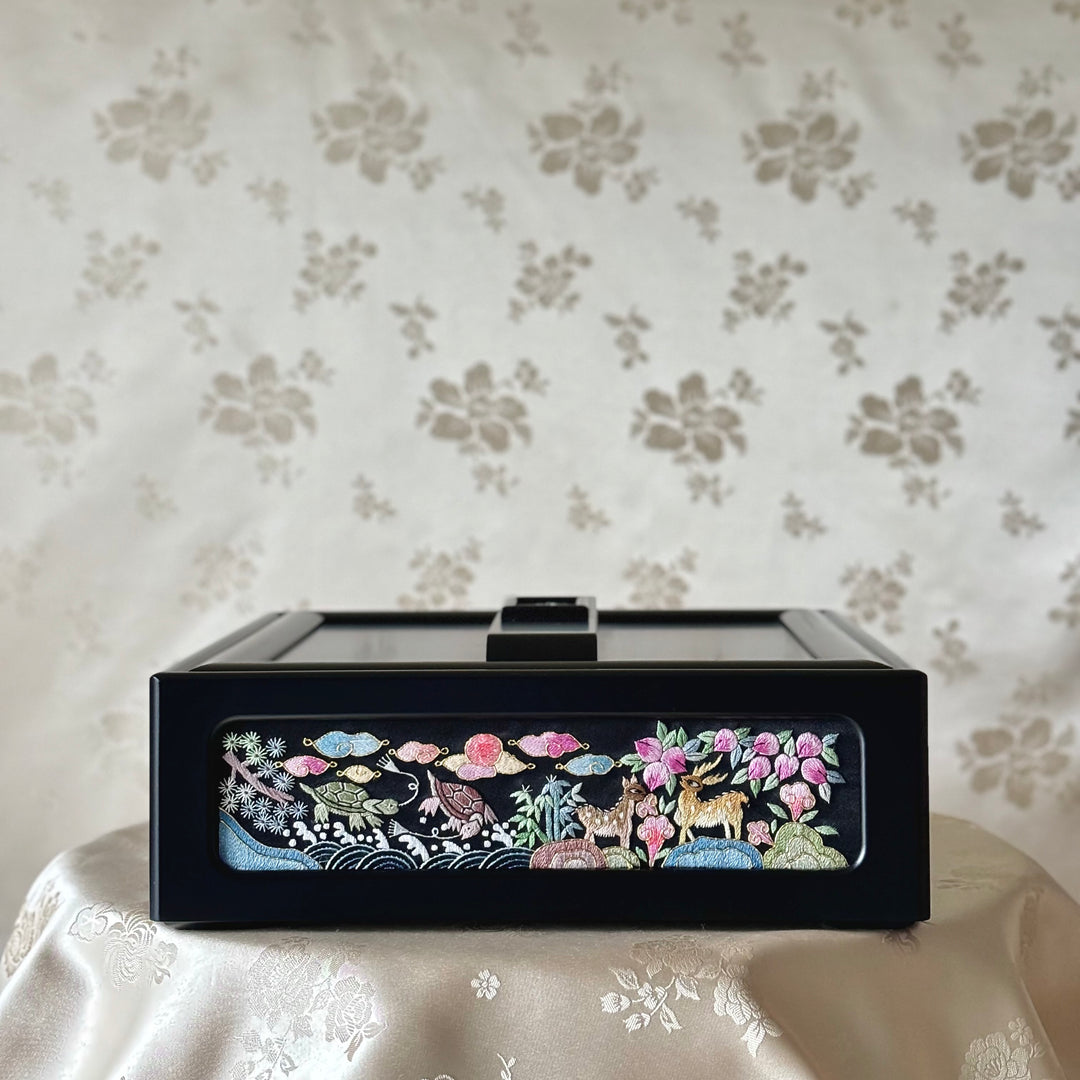長寿のシンボルで飾られた箱の各面には、鹿、亀、松、太陽など時代を超えたモチーフを描いた精巧な刺繍が施されています。韓国文化に深く根付いたこれらのシンボルは、永続的な健康、幸福、繁栄への願いを伝えます。