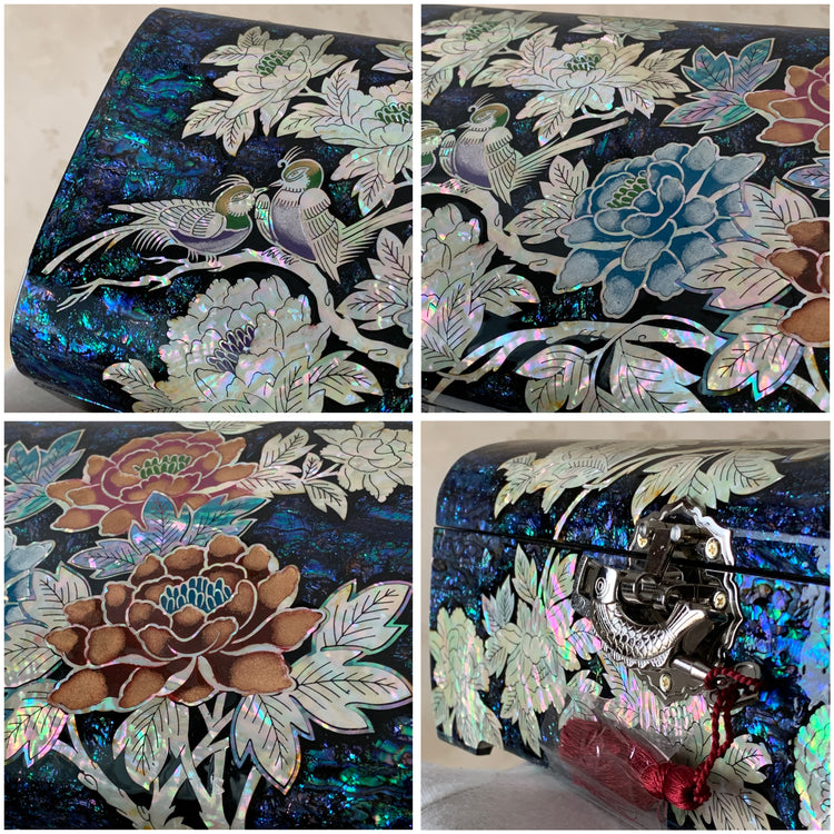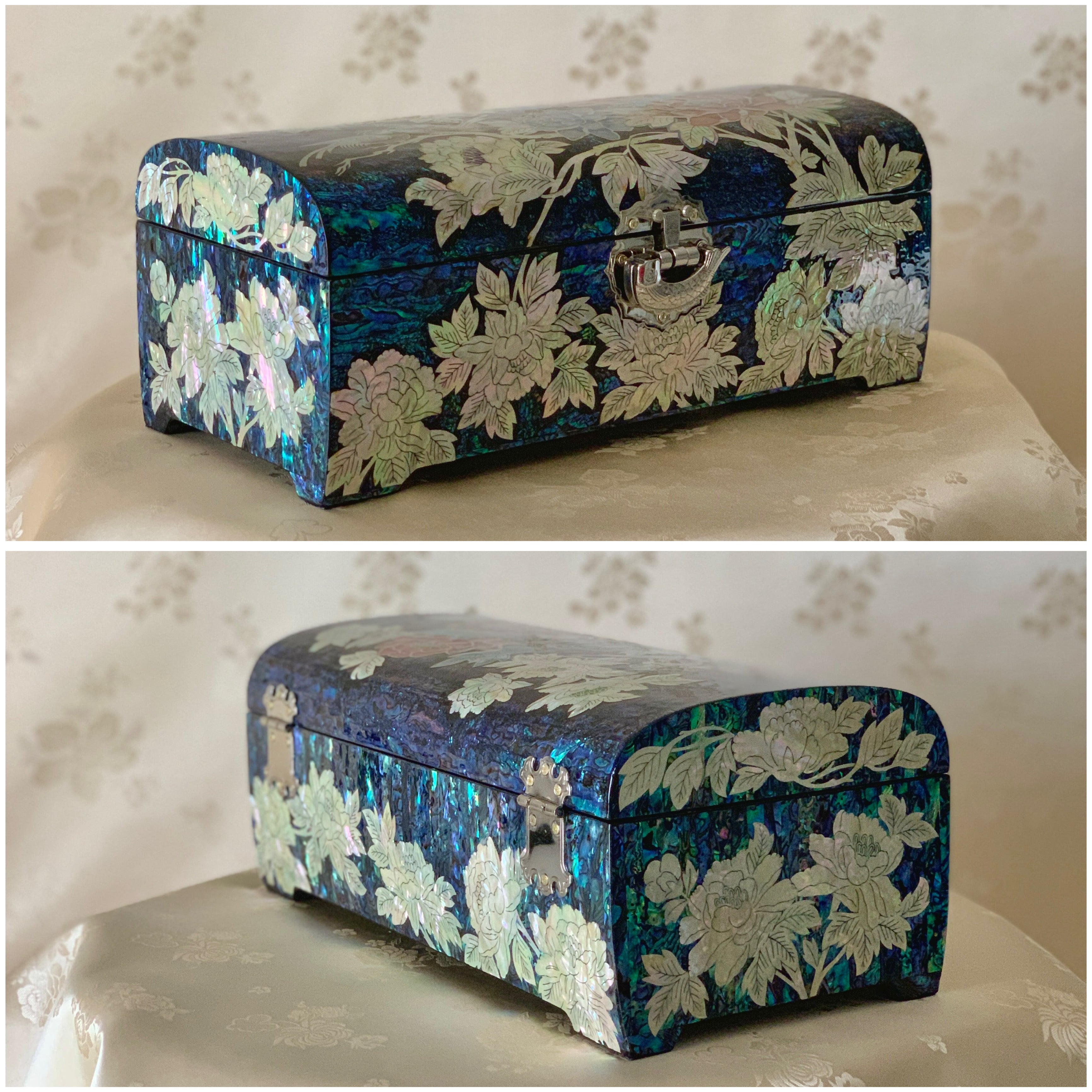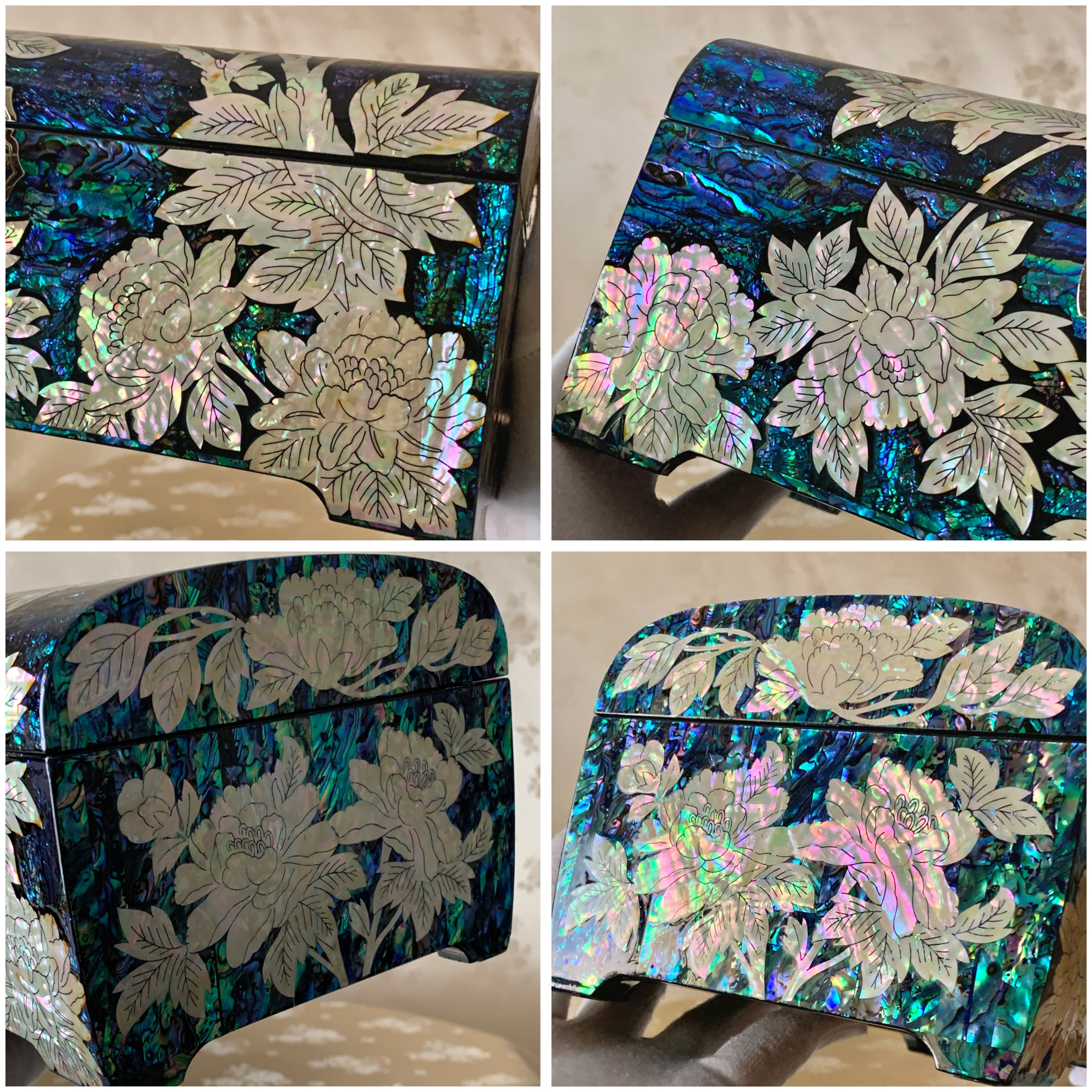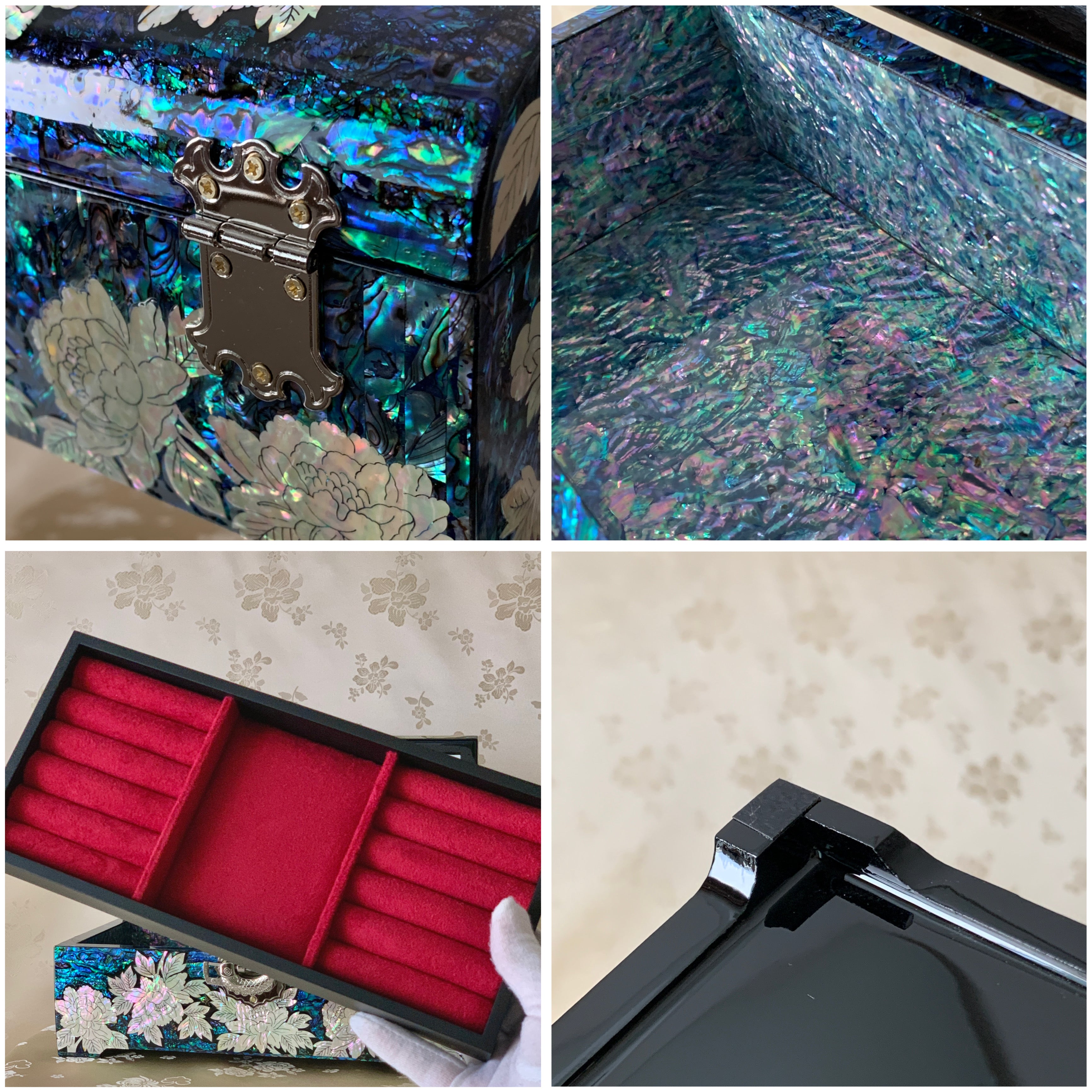見事な牡丹と鳥の模様が描かれた、韓国の伝統的なマザーオブパールの手作りジュエリーボックスの絶妙な美しさをご覧ください。小さな指輪から大きなネックレスまで、貴重品を保管するのに最適なこのジュエリーボックスは、優雅さと機能性の両方を兼ね備えています。