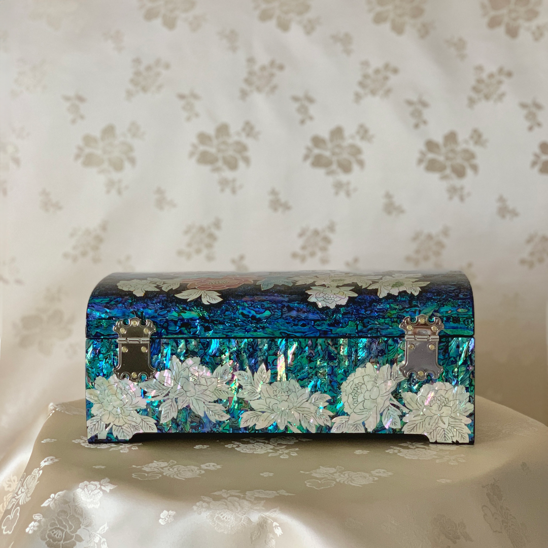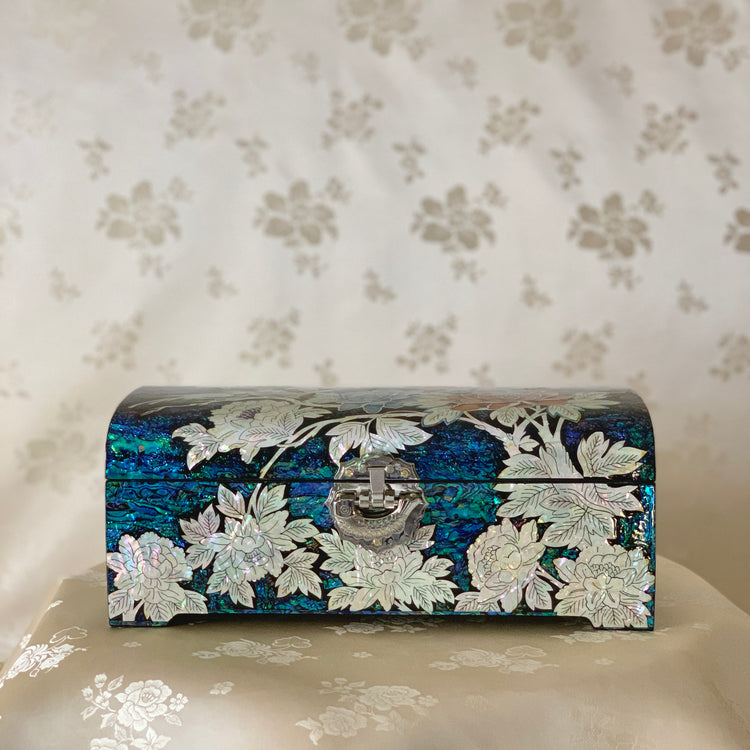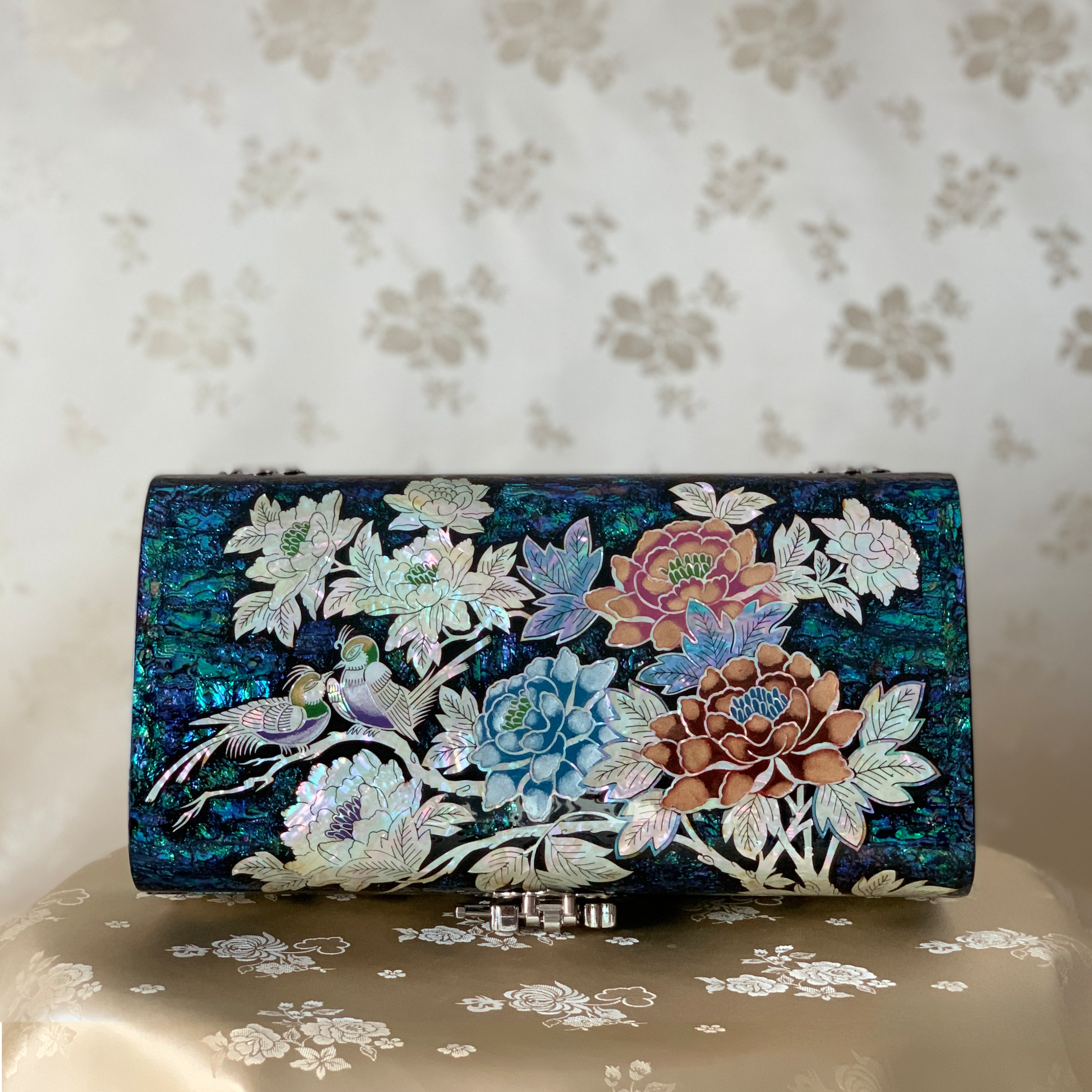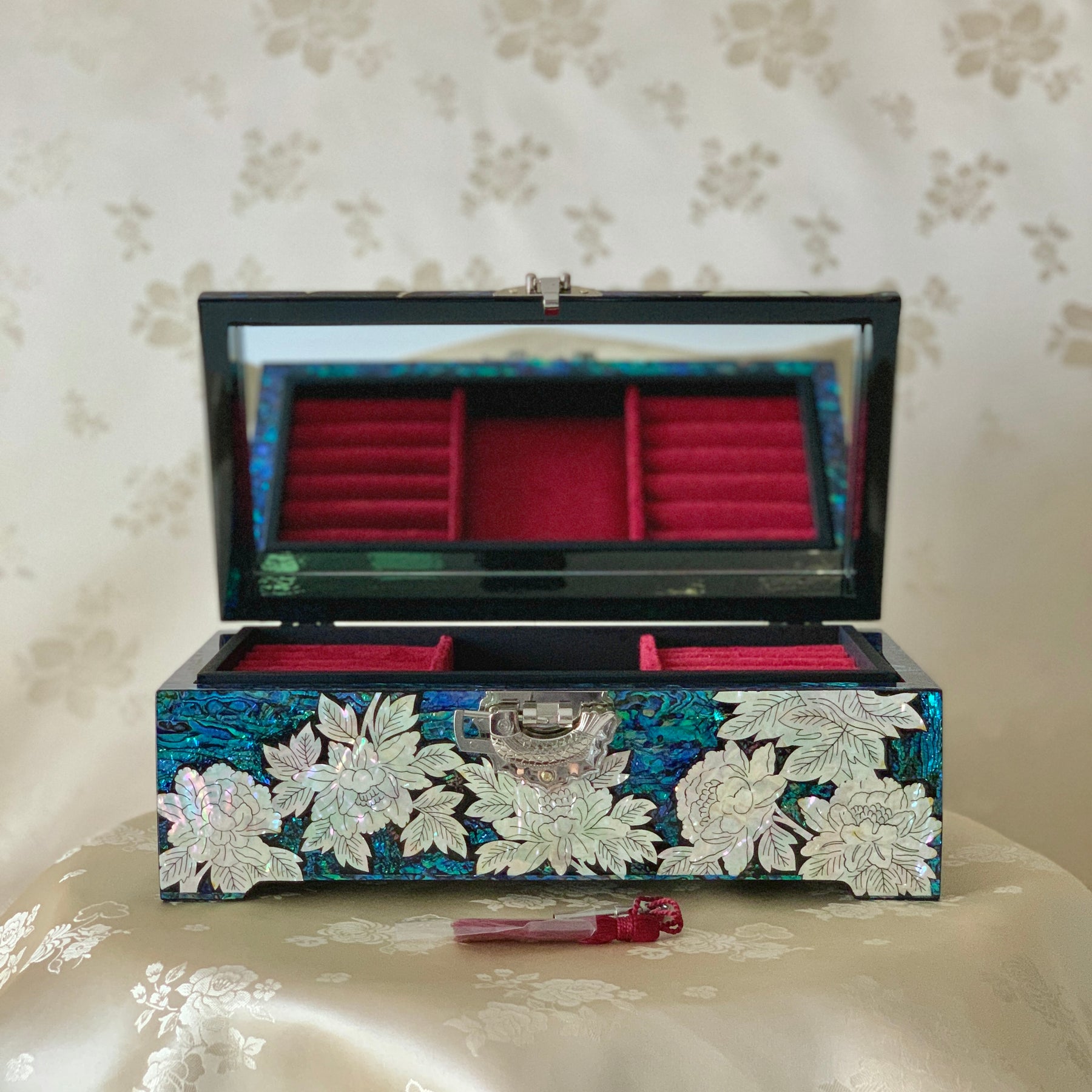 見事な牡丹と鳥の模様が描かれた、韓国の伝統的なマザーオブパールの手作りジュエリーボックスの絶妙な美しさをご覧ください。小さな指輪から大きなネックレスまで、貴重品を保管するのに最適なこのジュエリーボックスは、優雅さと機能性の両方を兼ね備えています。