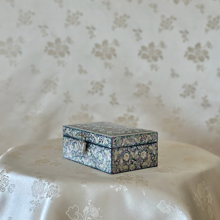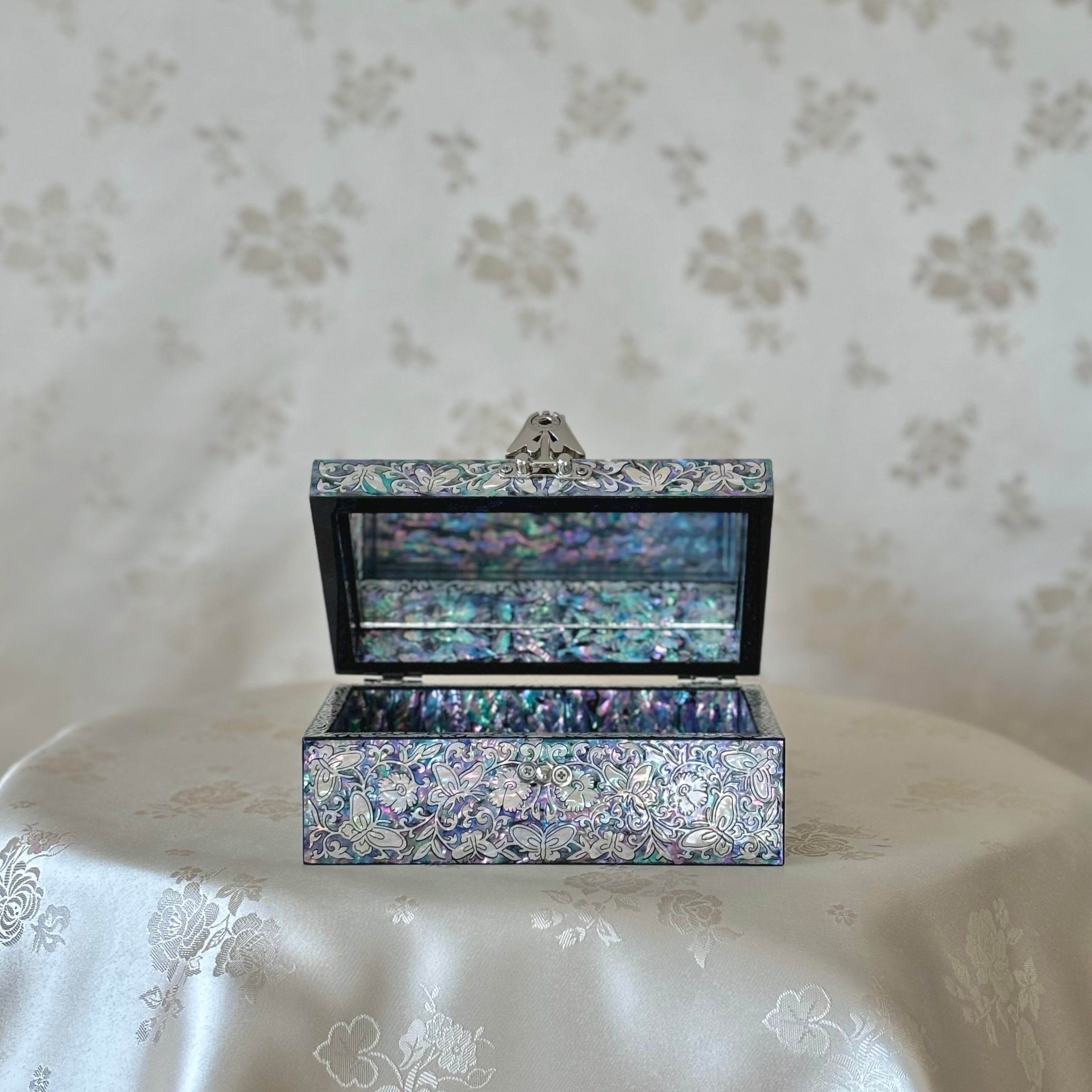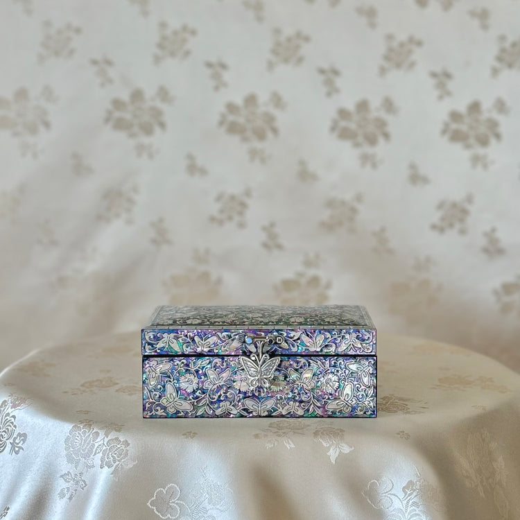 ジュエリーをたっぷり収納できるスペースで、お宝をスタイリッシュに保護します。マザー オブ パールの永遠の美しさを反映したこのボックスは、ユニークな貝殻の反射により常に新しく見えます。調和のとれた蝶と蔓のモチーフは、幸福と長寿を象徴しています。