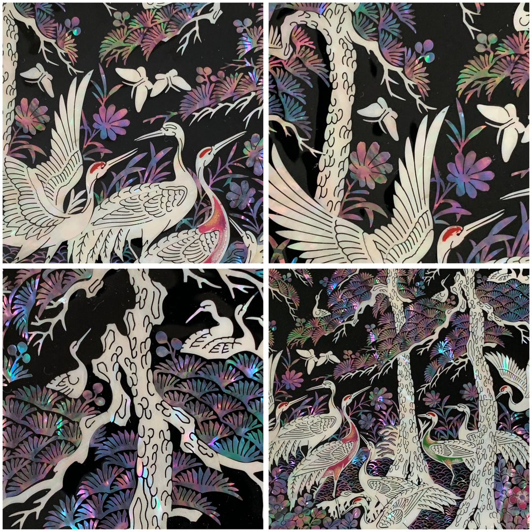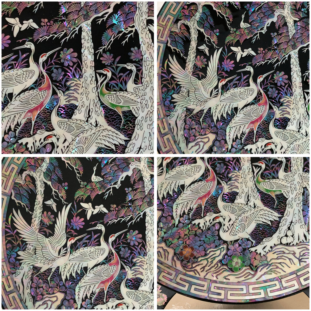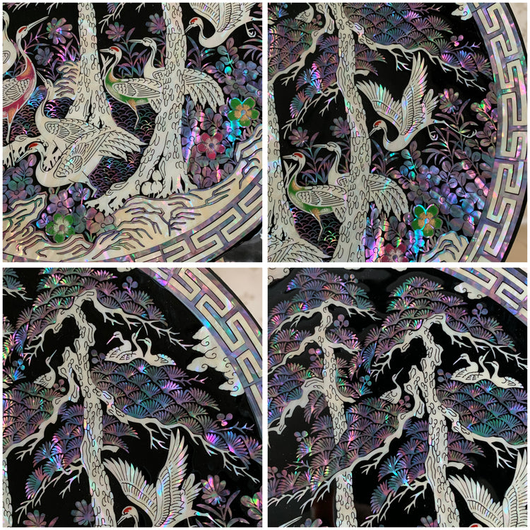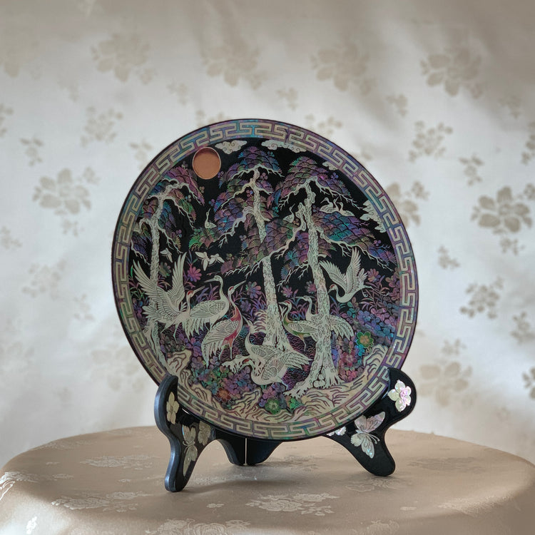 この見事な皿(자개 송학문 접시)は、天然の螺鈿と漆で作られた韓国の伝統芸術の傑作です。