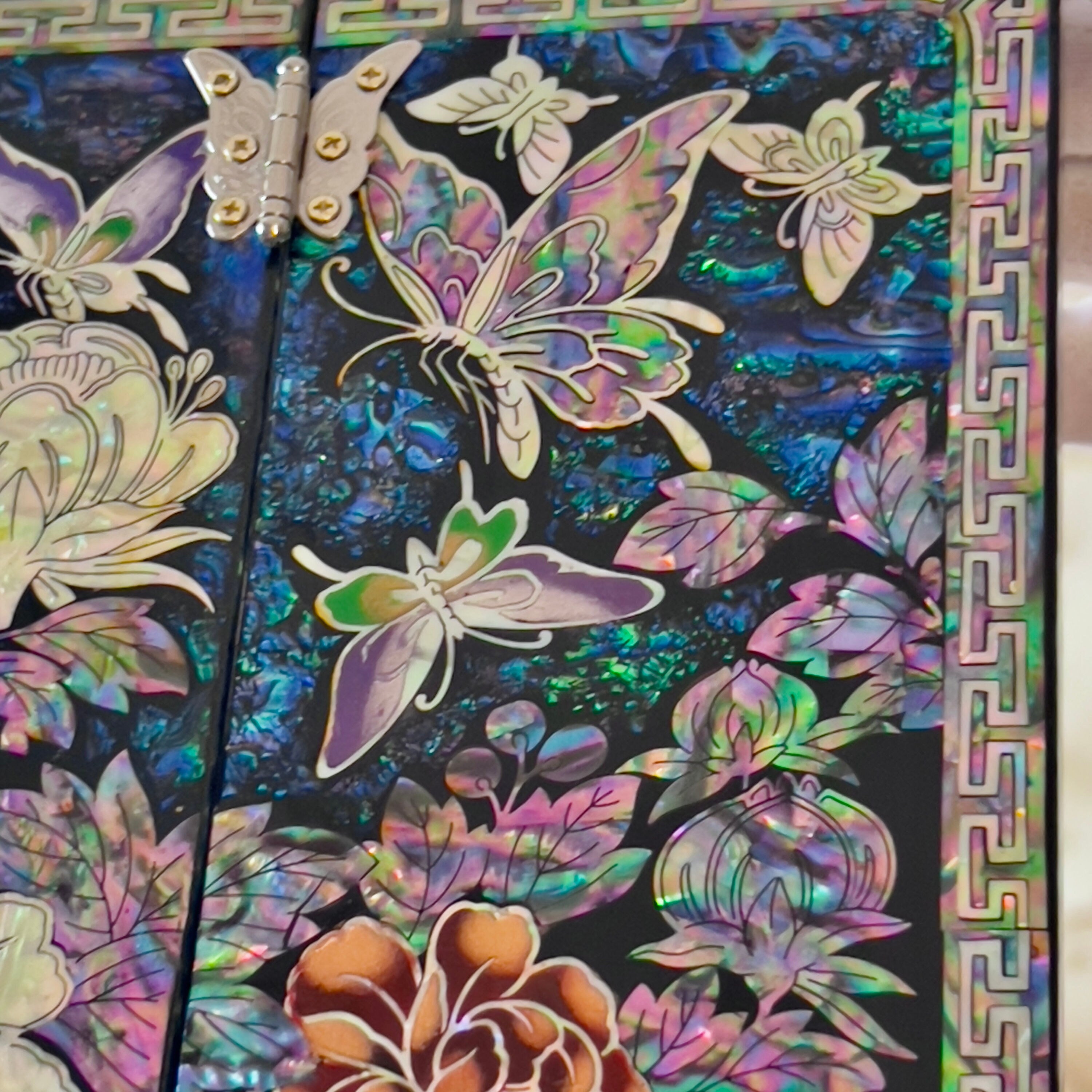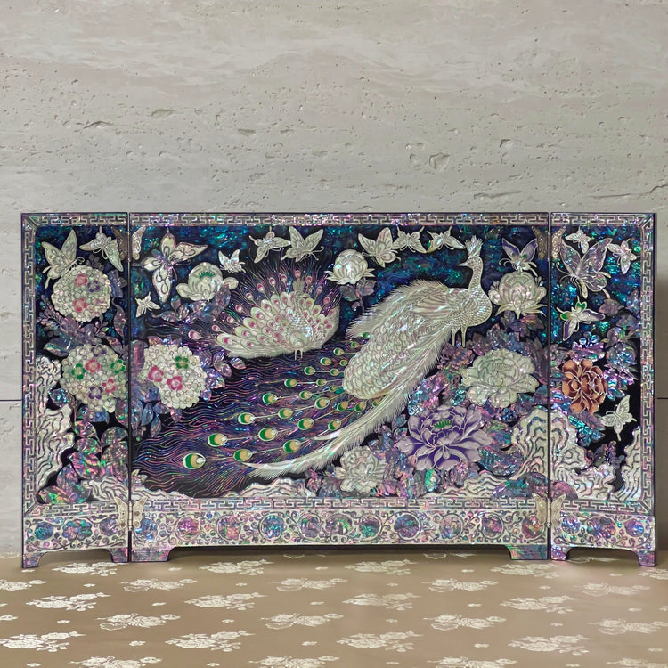 この限定版 3 パネル マザー オブ パール フォールディング スクリーン (자개 공작문 세폭 병풍) で、韓国の伝統の時代を超えた美しさと精巧な職人技を堪能してください。この絶妙な作品は、最高級のマザー オブ パールを使用して精巧に象嵌された、孔雀、蝶、牡丹の調和のとれたデザインが特徴です。スクリーンを縁取るエレガントなつる模様がさらに高級感を添え、あらゆる空間の理想的なセンターピースになります。