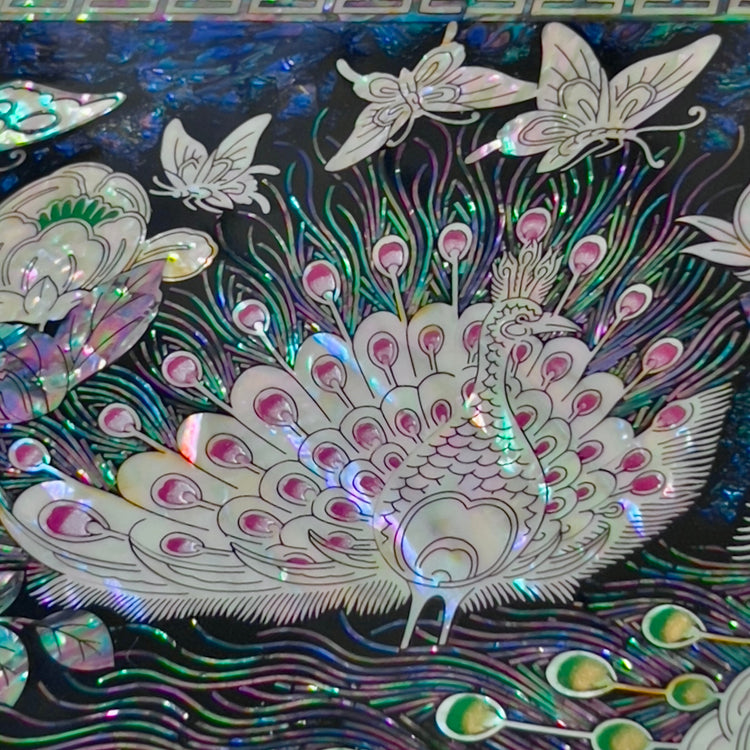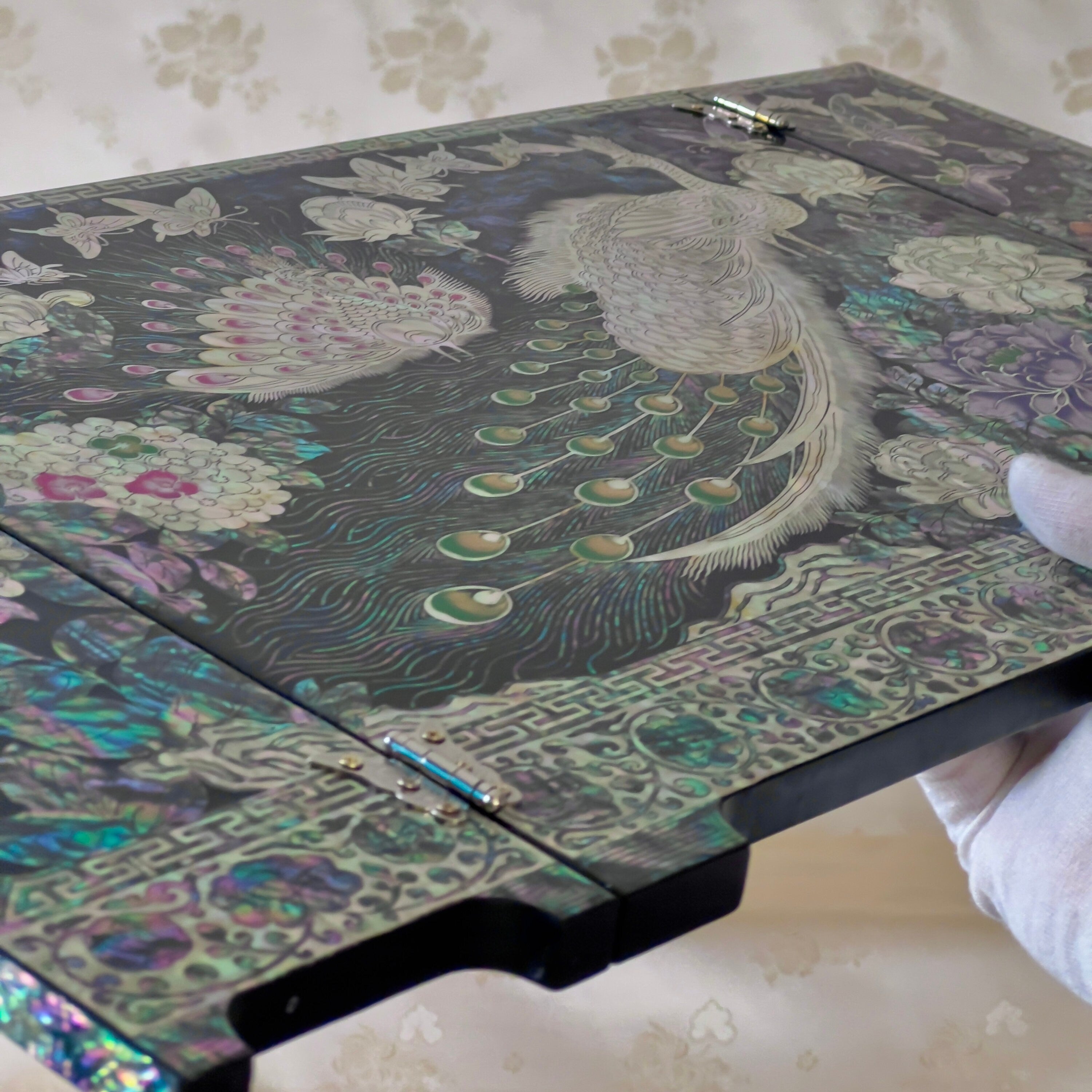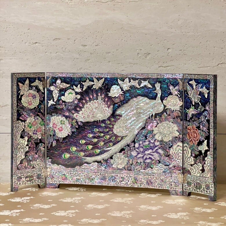 このエレガントな折りたたみ式スクリーンをリビングルームや書斎のテーブルの上に置いて、その精巧なデザインを間近で鑑賞する様子を想像してみてください。一日を通して光が変化すると、螺鈿細工の象嵌が光を捉えて反射し、孔雀が生き生きと浮かび上がります。このスクリーンは美しい焦点となるだけでなく、会話のきっかけにもなり、洗練されたセンスと韓国の芸術性への感謝の象徴にもなります。ゲストをもてなすときも、自宅で静かなひとときを楽しむときも、この作品は空間に紛れもない贅沢感と文化的遺産を加えてくれます。