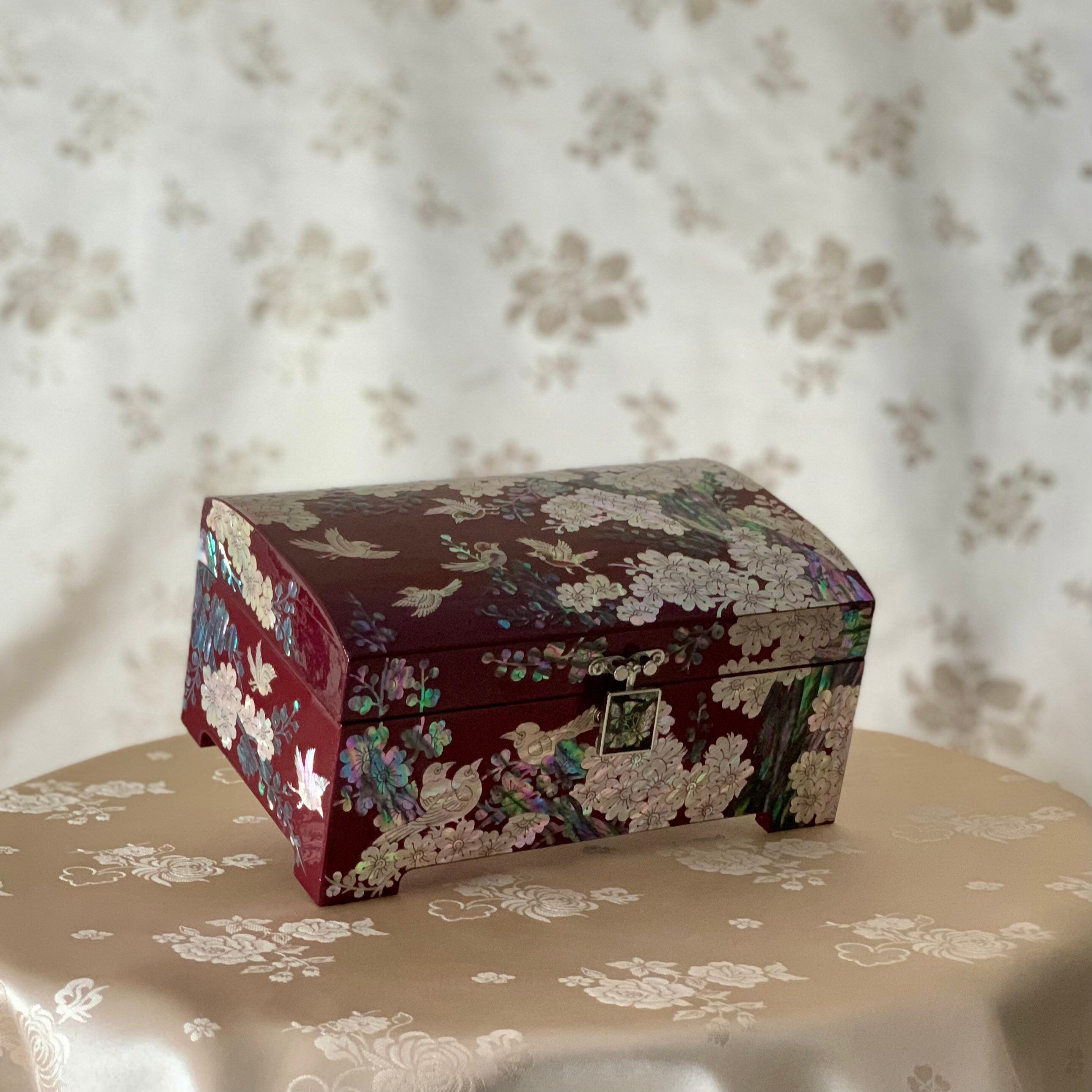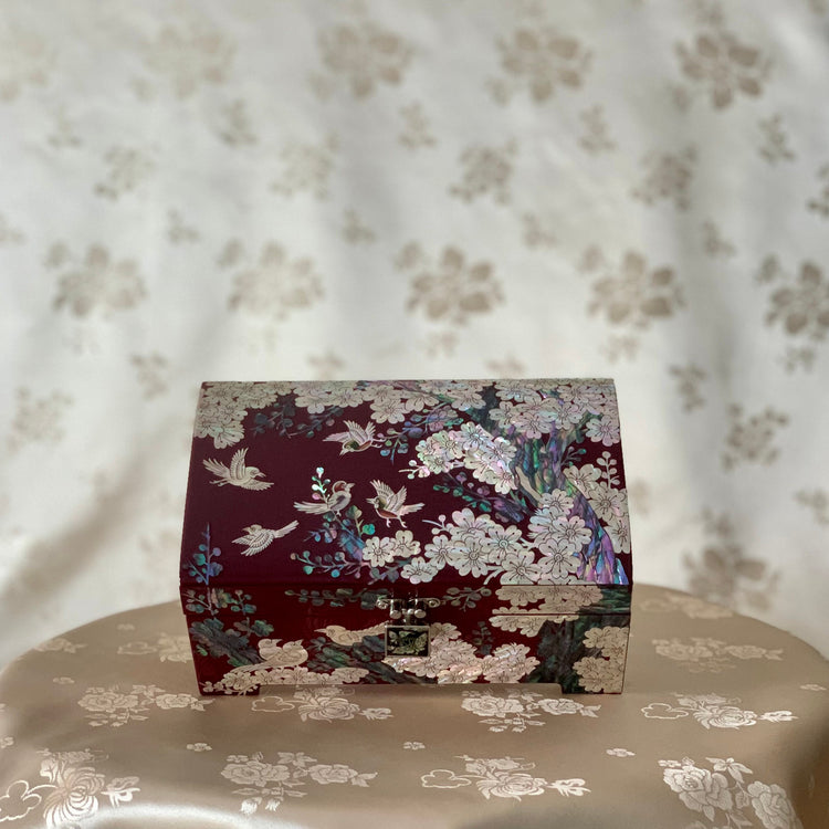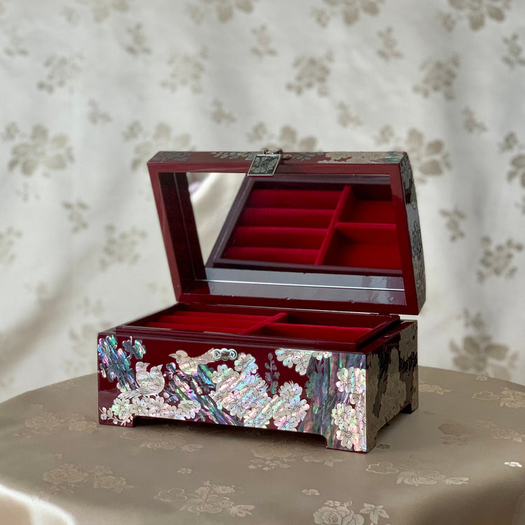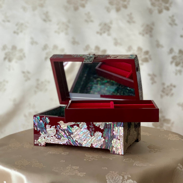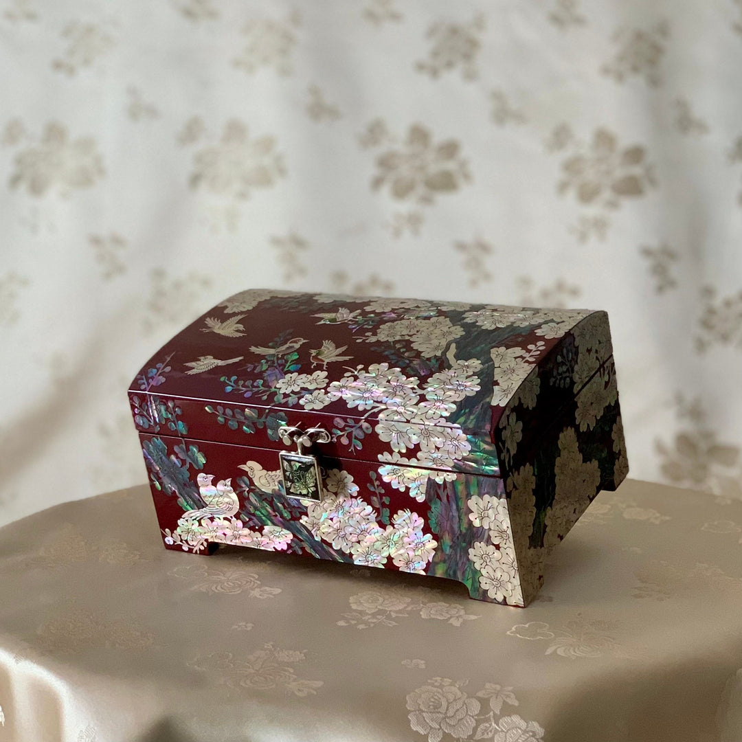 鳥と梅の木の模様が入ったマザーオブパールのジュエリーボックス (자개 매조문 보석함)