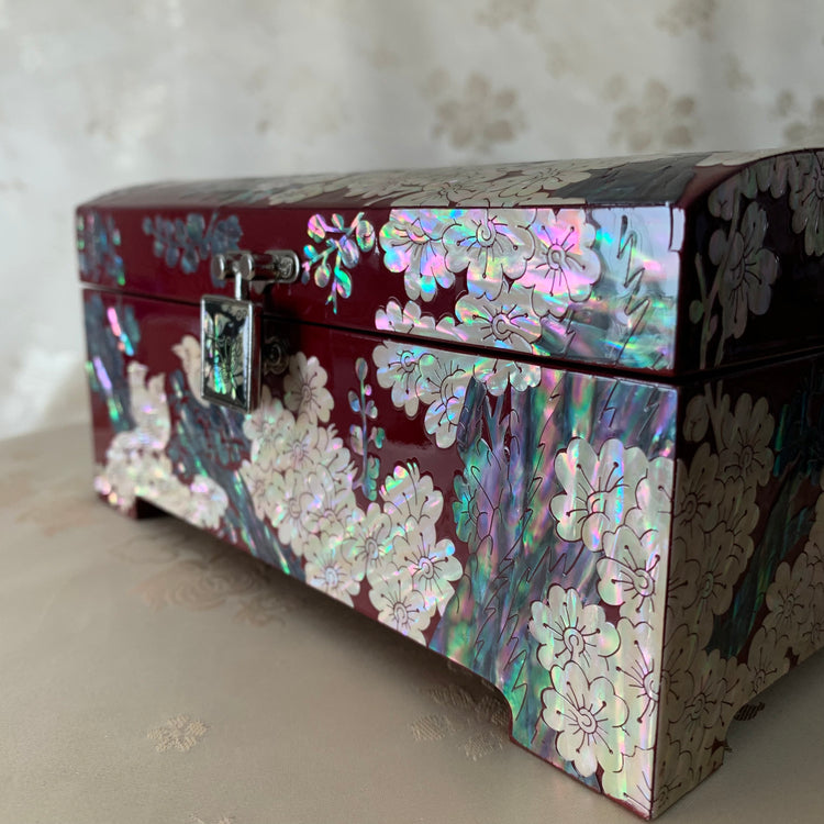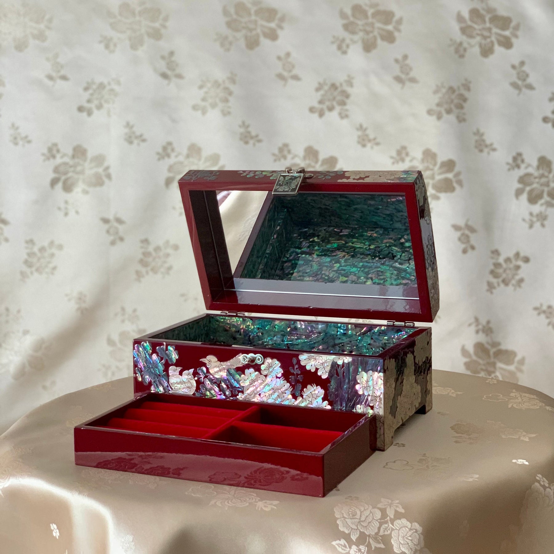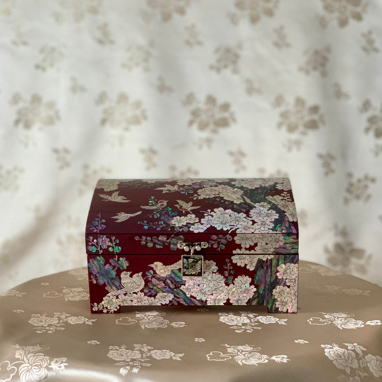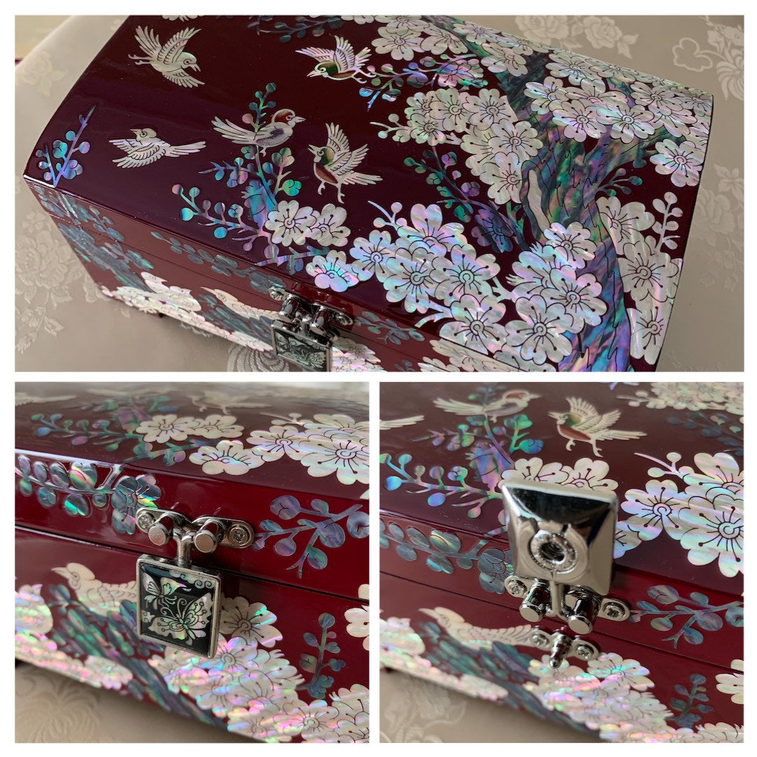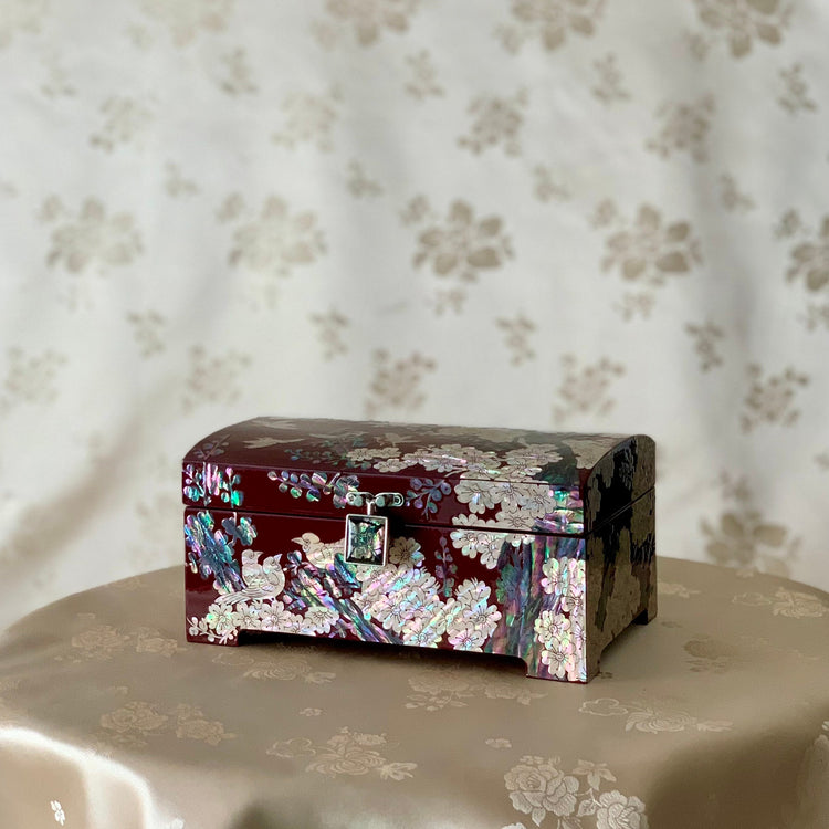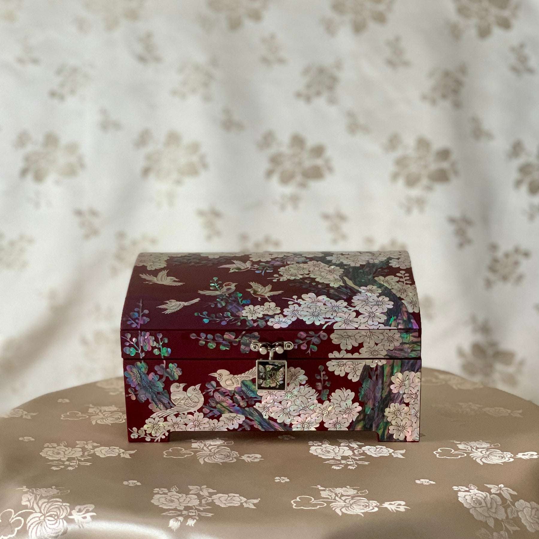 鳥と梅の木の模様が入ったマザーオブパールのジュエリーボックス (자개 매조문 보석함)