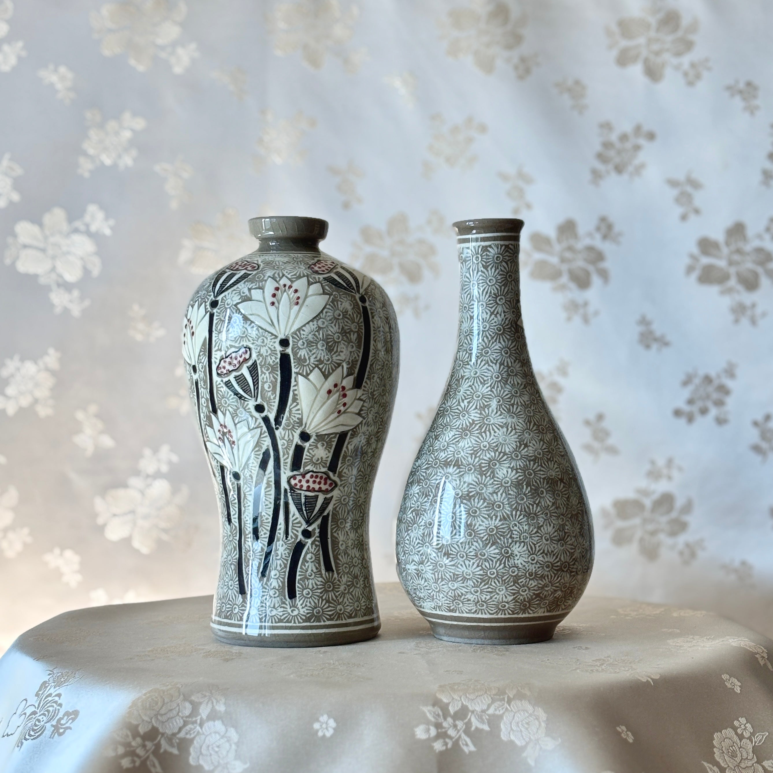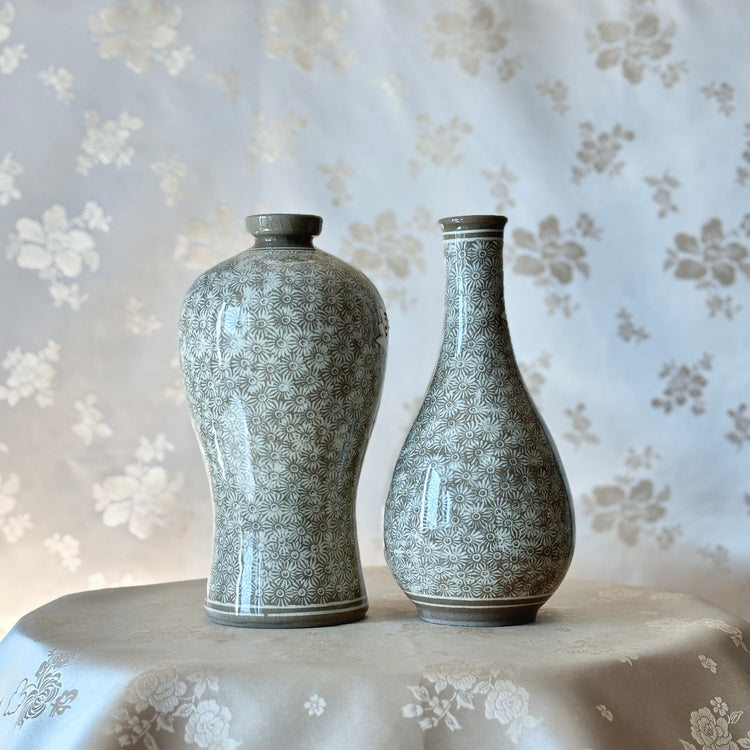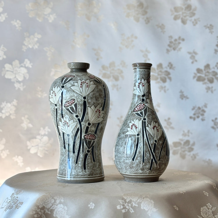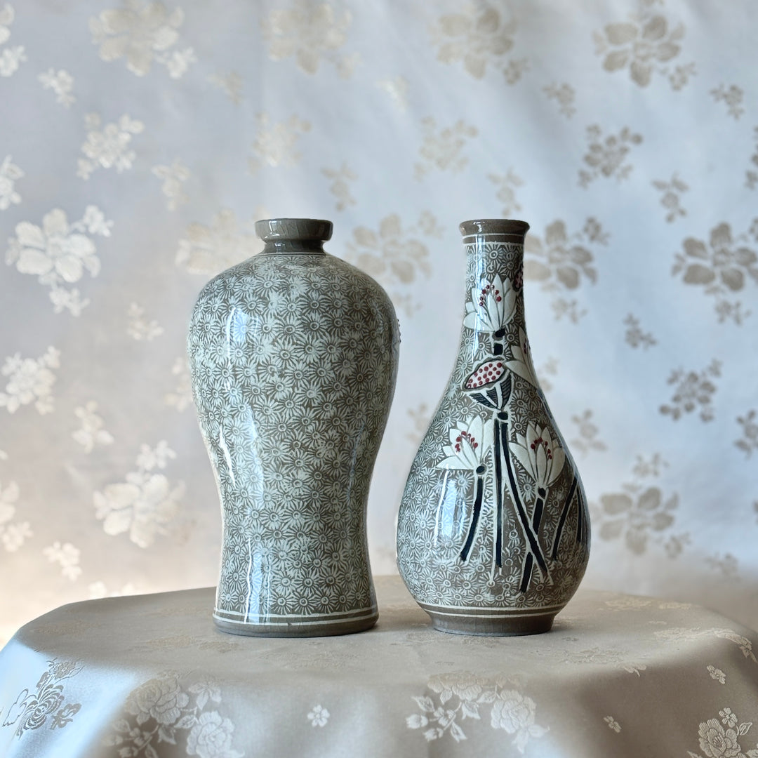 Buncheong Ware Vase Set: Lotus Flower Inlay and Chrysanthemum Stamped Designs