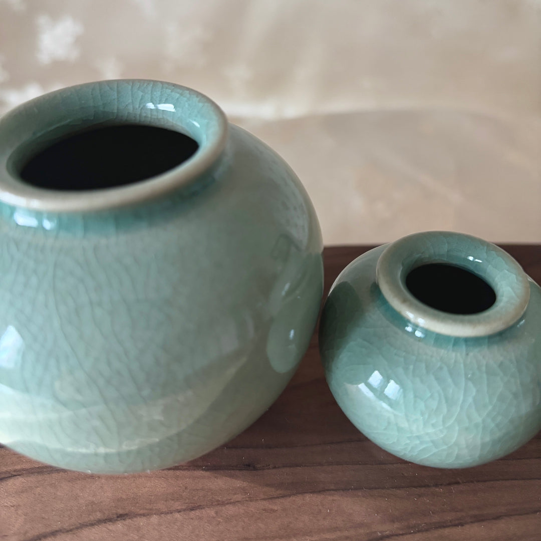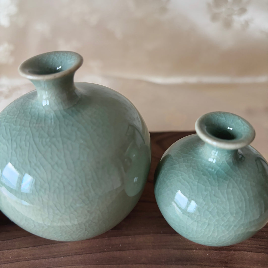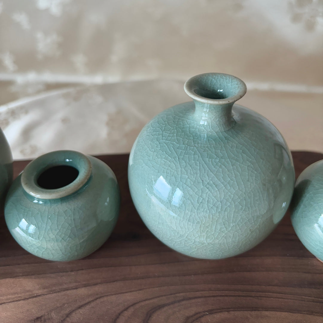 Imagine sitting by a sunlit window, admiring this vase set as the light dances across the celadon glaze, revealing its intricate crackled pattern. This small yet captivating collection invites moments of calm and introspection, transforming any ordinary moment into something extraordinary.