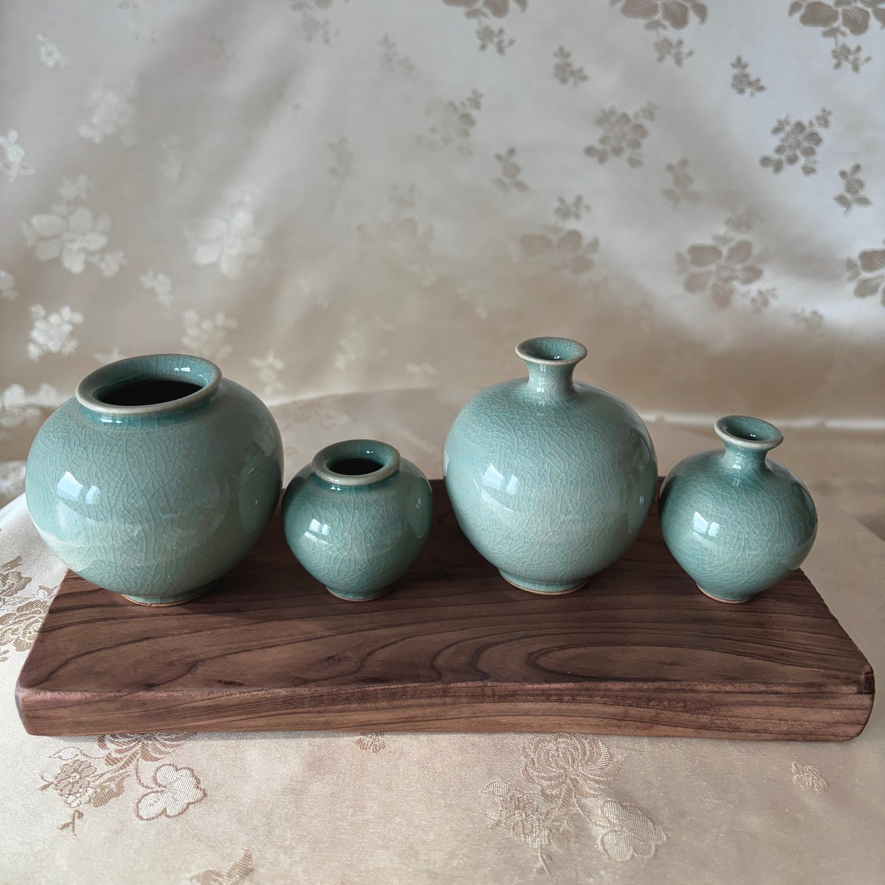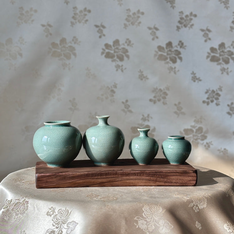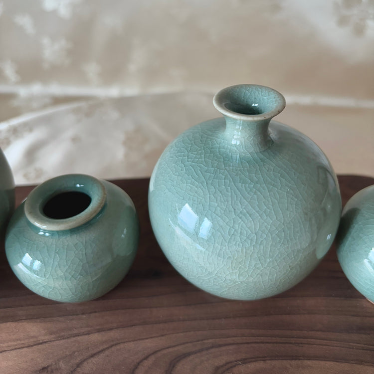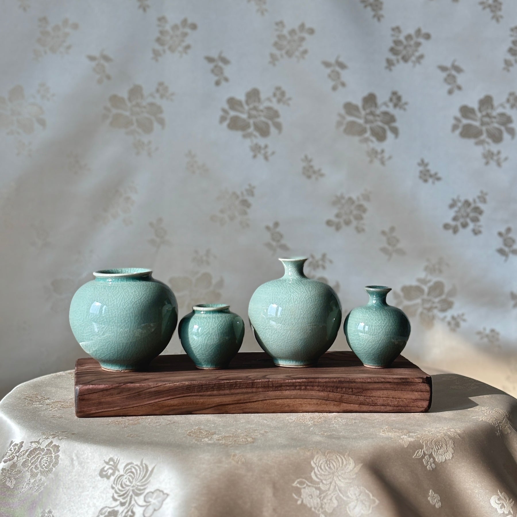 This Korean Handmade Celadon Miniature Vase Set captures the essence of classic celadon pottery in a compact and charming collection. Featuring four delicately crafted vases in varying shapes, this set highlights the serene jade-green hue and natural crackled glaze of celadon, resting gracefully on a smooth wooden base.
