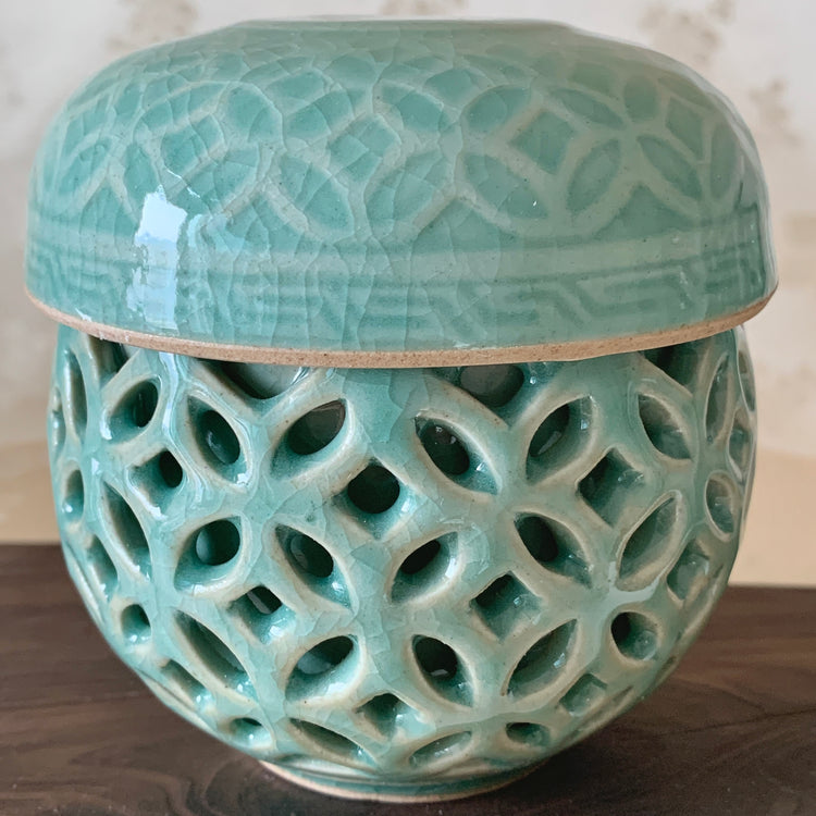 Discover the exquisite artistry of our Korean Handmade Celadon Set of Two Double Wall Openwork Tea Cups (청자 칠보문 이중투각 찻잔), featuring the iconic Chilbo Pattern, revered for its association with royal palaces where it symbolizes good fortune.