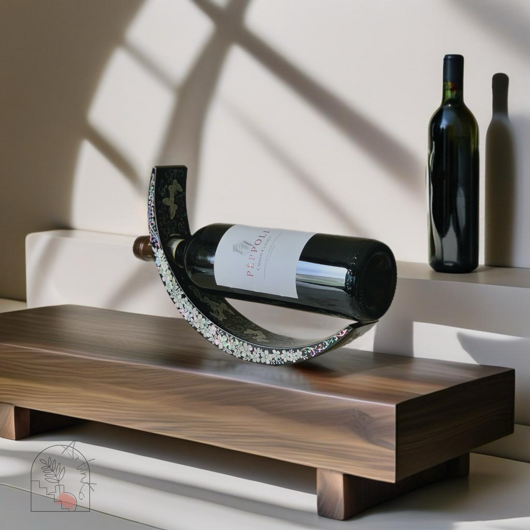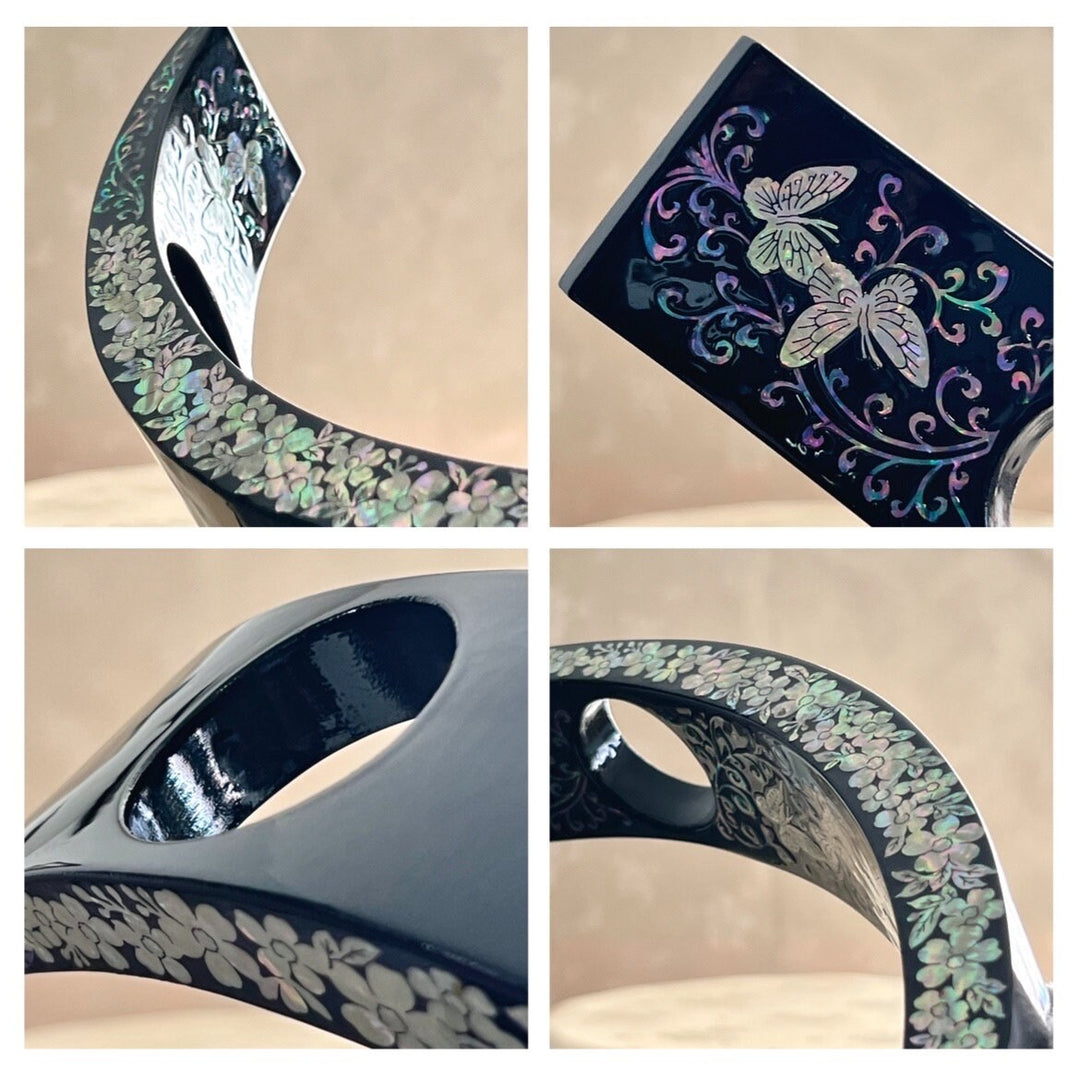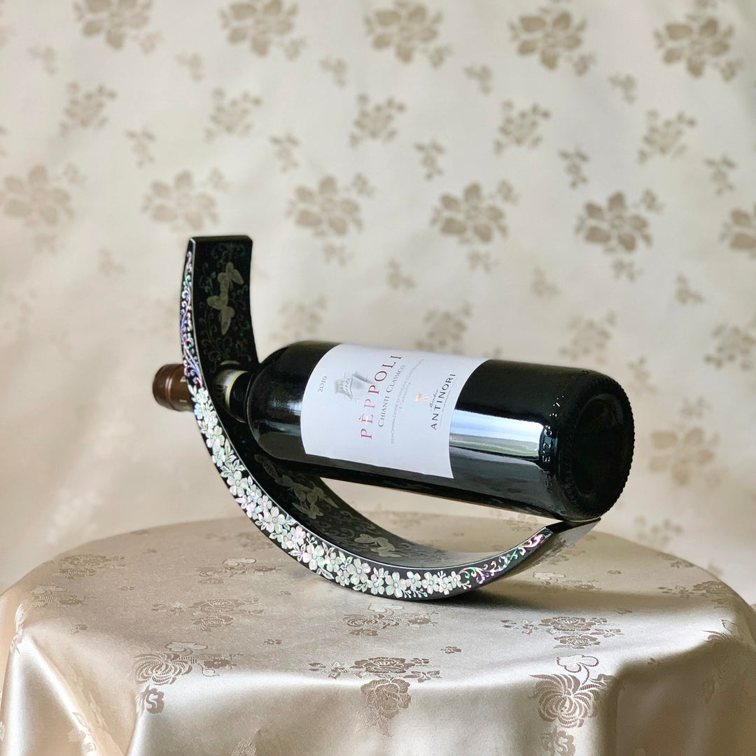 Enhance your wine presentation with this elegant Mother of Pearl Handmade Wine Holder, showcasing the timeless beauty of Korean craftsmanship. The holder is crafted from fine wood and intricately inlaid with mother of pearl, featuring a captivating butterfly motif. This design symbolizes joy and transformation, bringing both aesthetic and cultural value to your space.
