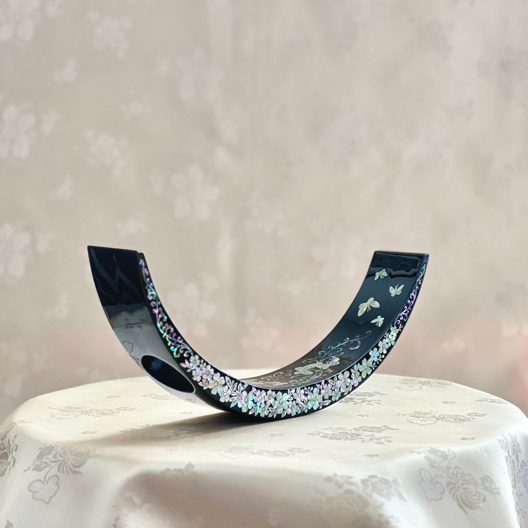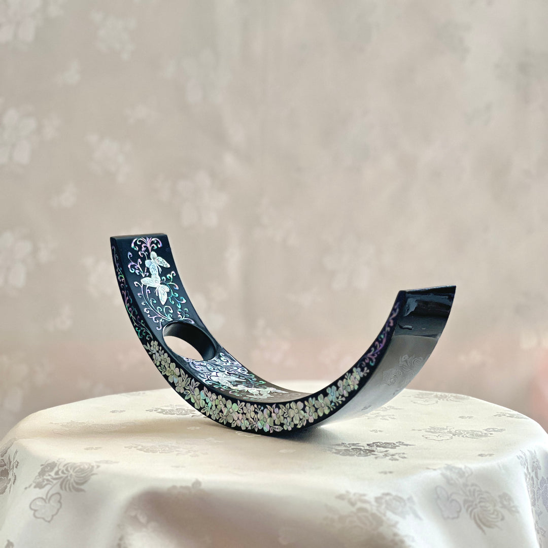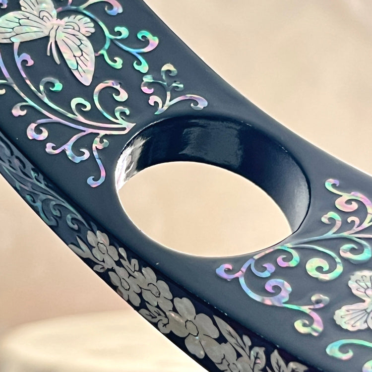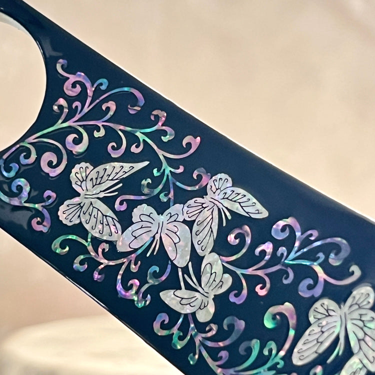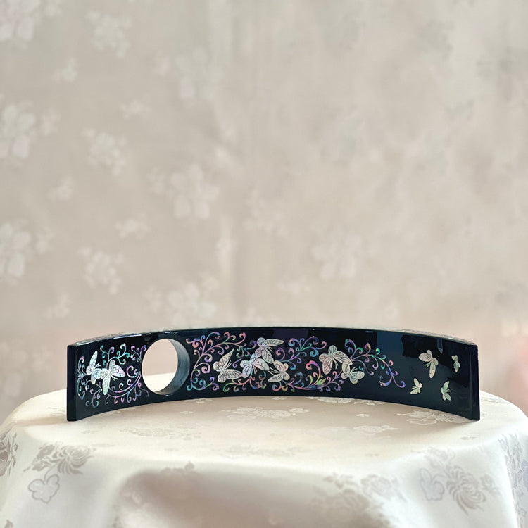 Enhance your wine presentation with this elegant Mother of Pearl Handmade Wine Holder, showcasing the timeless beauty of Korean craftsmanship. The holder is crafted from fine wood and intricately inlaid with mother of pearl, featuring a captivating butterfly motif. This design symbolizes joy and transformation, bringing both aesthetic and cultural value to your space.