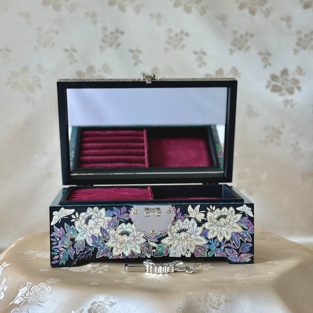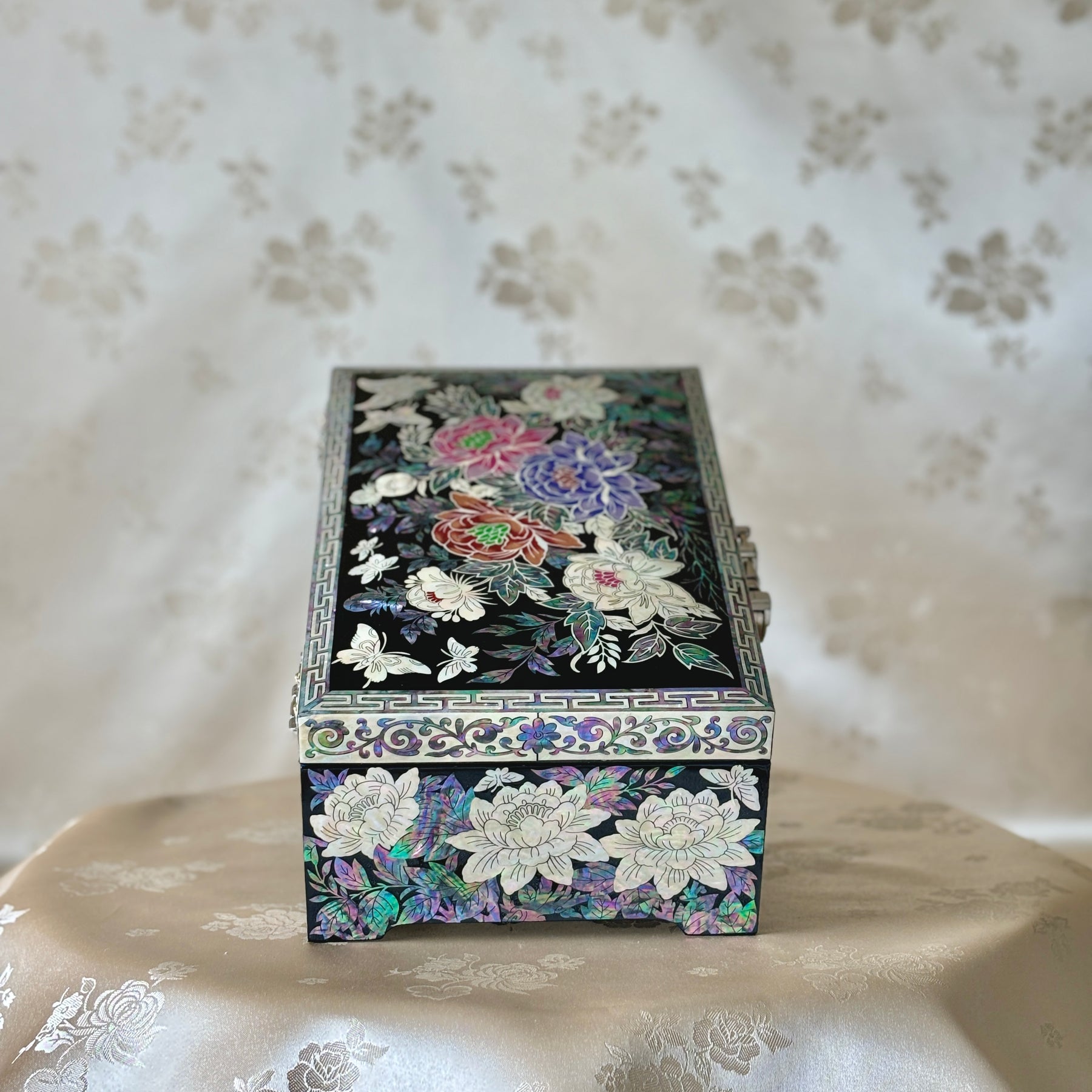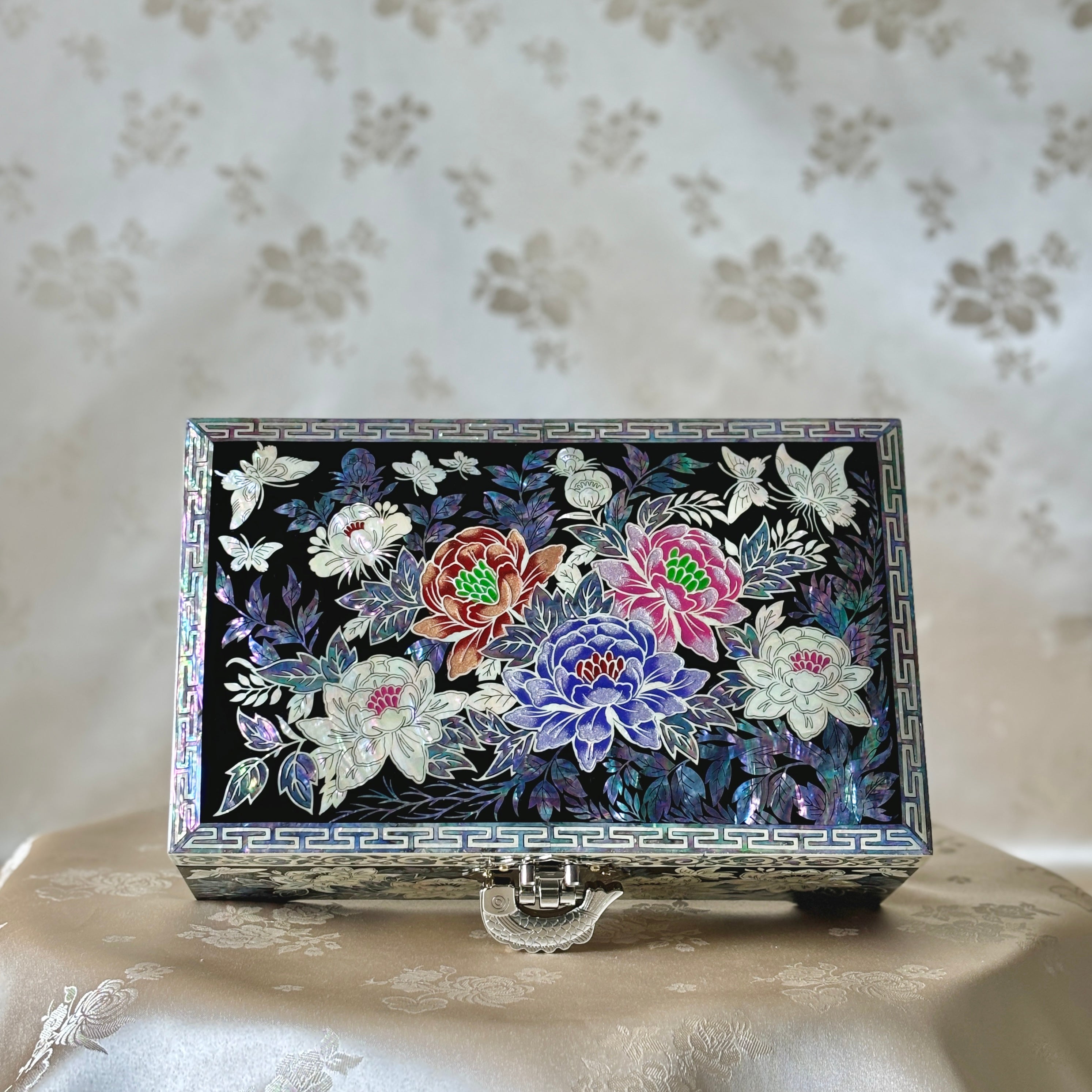 Presenting the Korean Traditional Handmade Mother of Pearl Jewelry Box with Butterfly and Peony Pattern (자개 호접 목단문 보석함). This exquisite jewelry box is a testament to traditional Korean craftsmanship, featuring intricate mother of pearl inlay work and a design that symbolizes beauty and elegance.