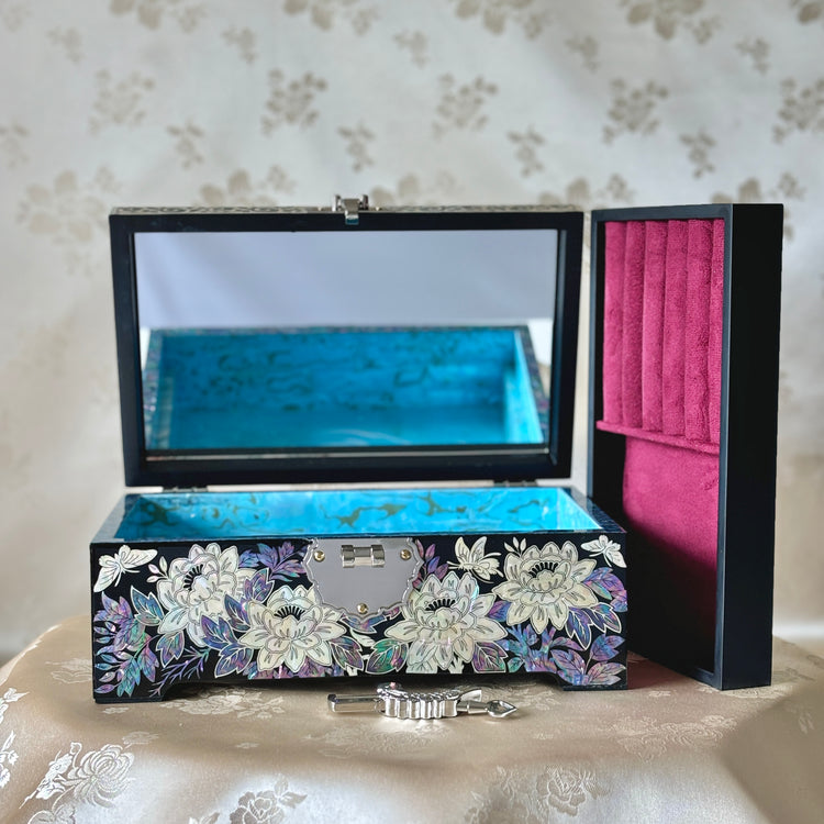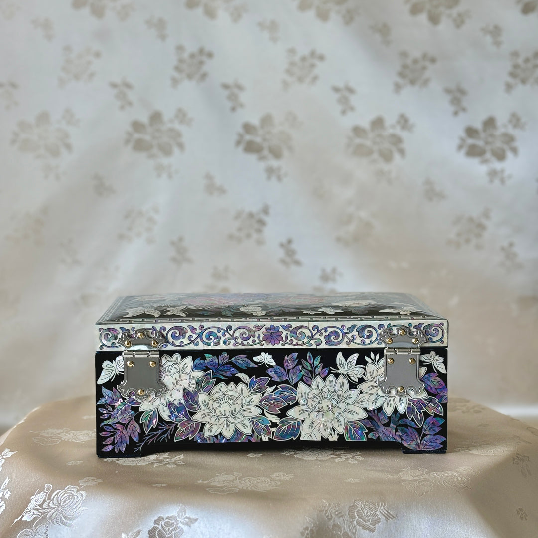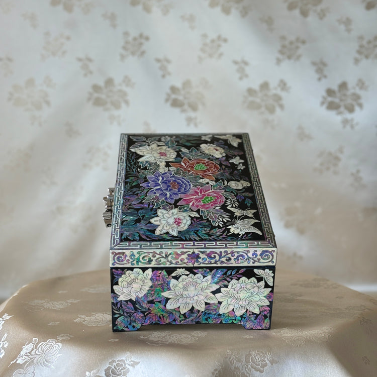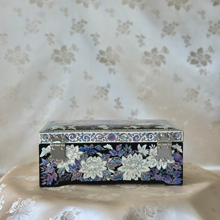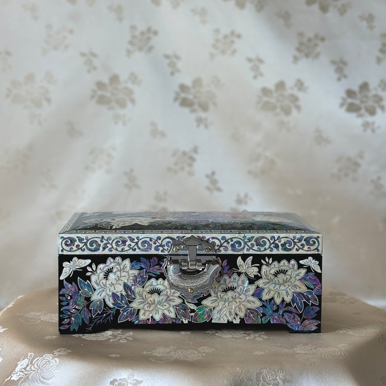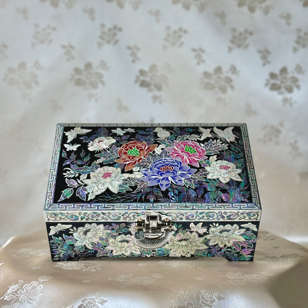 Presenting the Korean Traditional Handmade Mother of Pearl Jewelry Box with Butterfly and Peony Pattern (자개 호접 목단문 보석함). This exquisite jewelry box is a testament to traditional Korean craftsmanship, featuring intricate mother of pearl inlay work and a design that symbolizes beauty and elegance.
