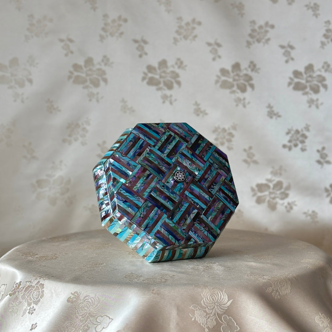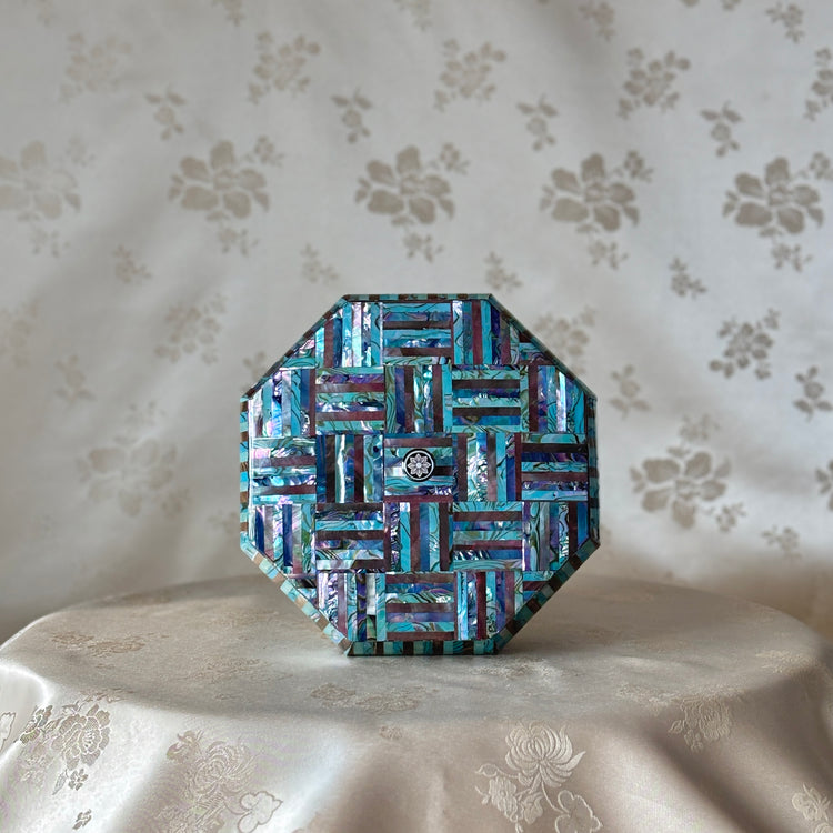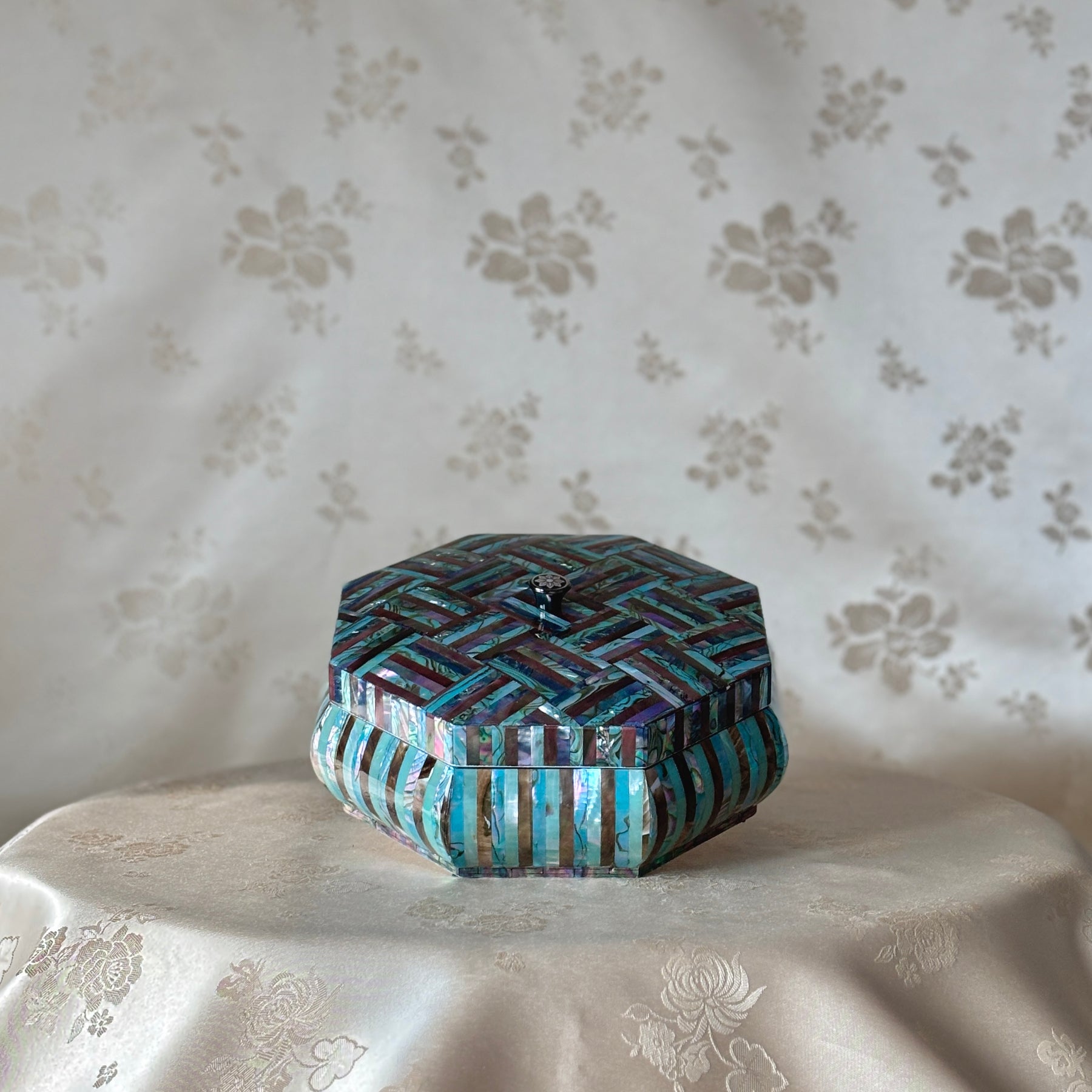 This limited edition octagonal jewelry box is an extraordinary showcase of Korean craftsmanship, blending intricate design with unparalleled elegance. The surface is adorned with a mosaic of radiant turquoise mother of pearl, interwoven with shimmering abalone edges, creating a luminous, frost-like finish. This luxurious piece serves not only as a jewelry box but also as a sophisticated container for keepsakes or fine treats, embodying refined beauty and functionality.