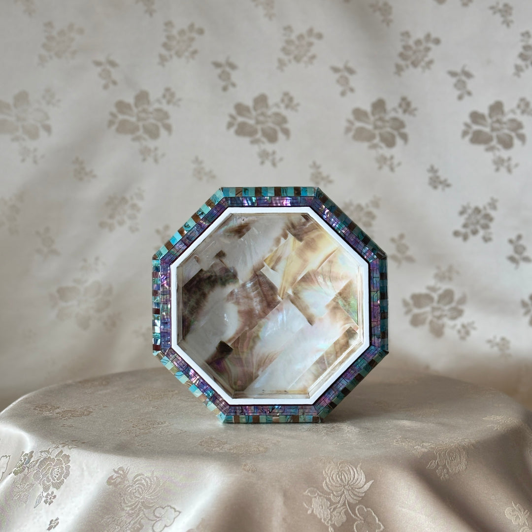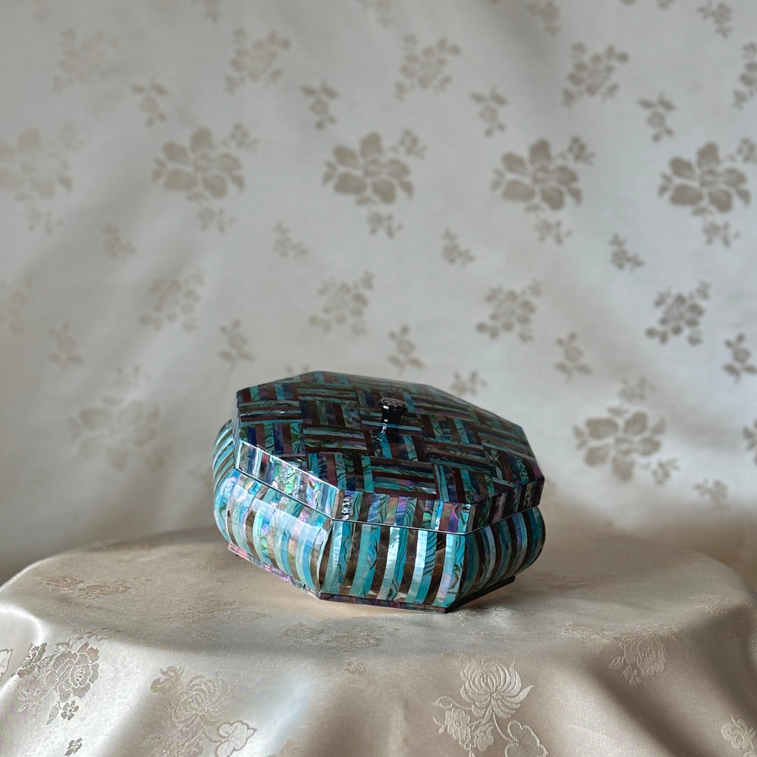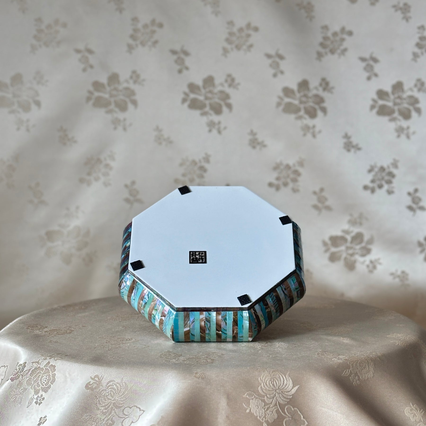 This limited edition octagonal jewelry box is an extraordinary showcase of Korean craftsmanship, blending intricate design with unparalleled elegance. The surface is adorned with a mosaic of radiant turquoise mother of pearl, interwoven with shimmering abalone edges, creating a luminous, frost-like finish. This luxurious piece serves not only as a jewelry box but also as a sophisticated container for keepsakes or fine treats, embodying refined beauty and functionality.