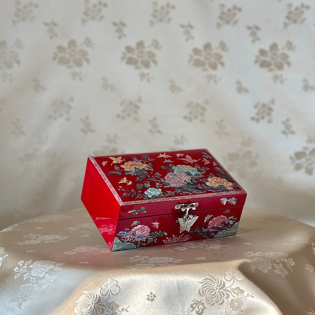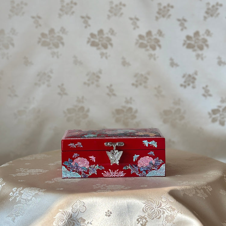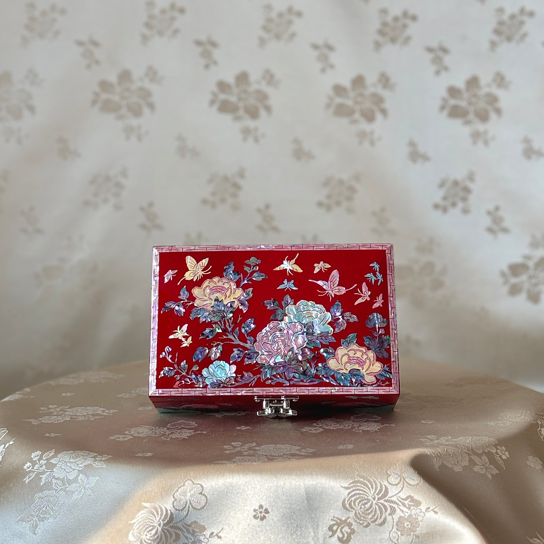 Mother of Pearl Red Jewelry Box with Peony and Butterfly Motif