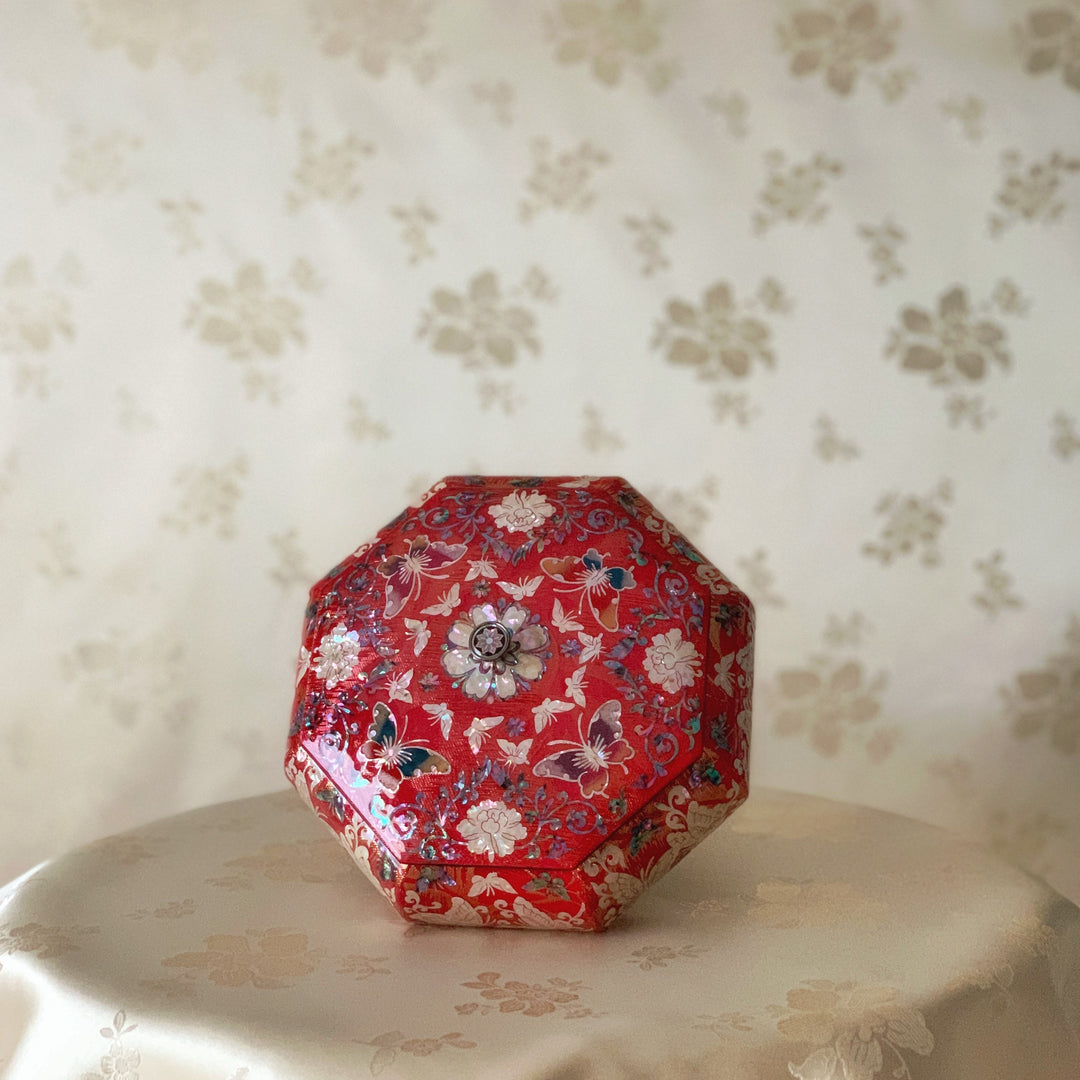 Red Korean Traditional Mother of Pearl Handmade Octagon Jewelry Box with Flowers and Butterflies