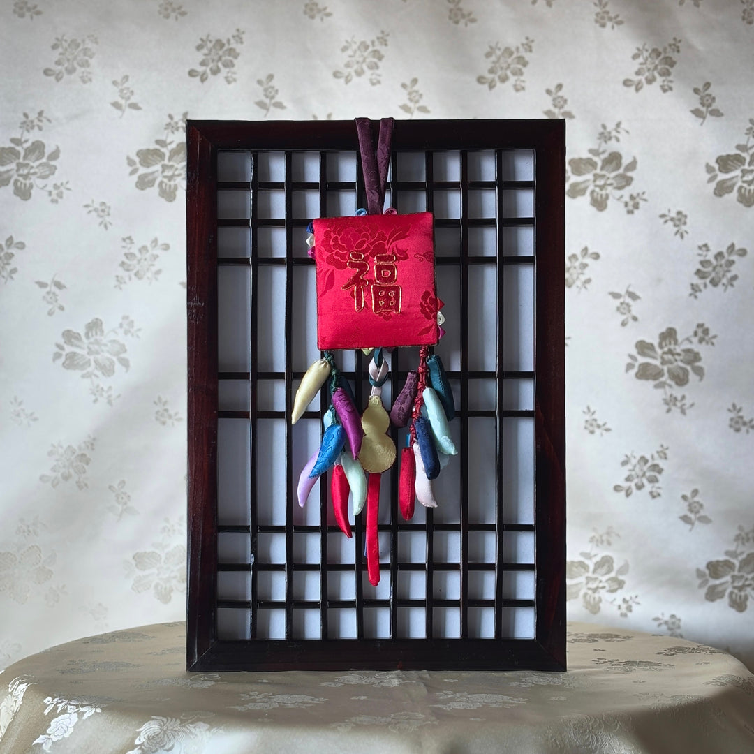One of the most distinctive features of this Norigae is the series of small silk chili peppers (고추, Gochu) hanging as tassels. In Korean folklore, red chili peppers are believed to ward off evil spirits and protect against misfortune. The vibrant mix of colors—red, blue, green, purple, and gold—adds a playful yet meaningful aesthetic, reinforcing the traditional belief that bright hues attract positive energy and prosperity.