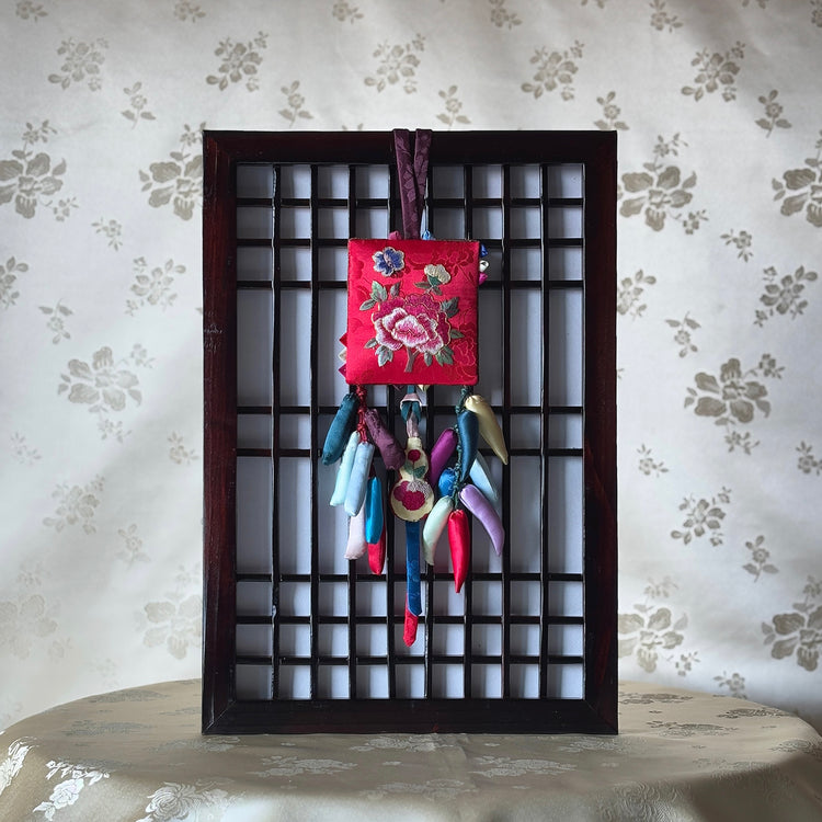 This handcrafted Korean Norigae features a square silk pouch (사각 주머니) beautifully embroidered with a peony (목단, Mokdan)—a revered symbol of wealth, honor, and prosperity in Korean tradition. The peony, often called the “king of flowers,” represents nobility and beauty, making this piece an elegant and auspicious ornament for Hanbok or decorative display.
