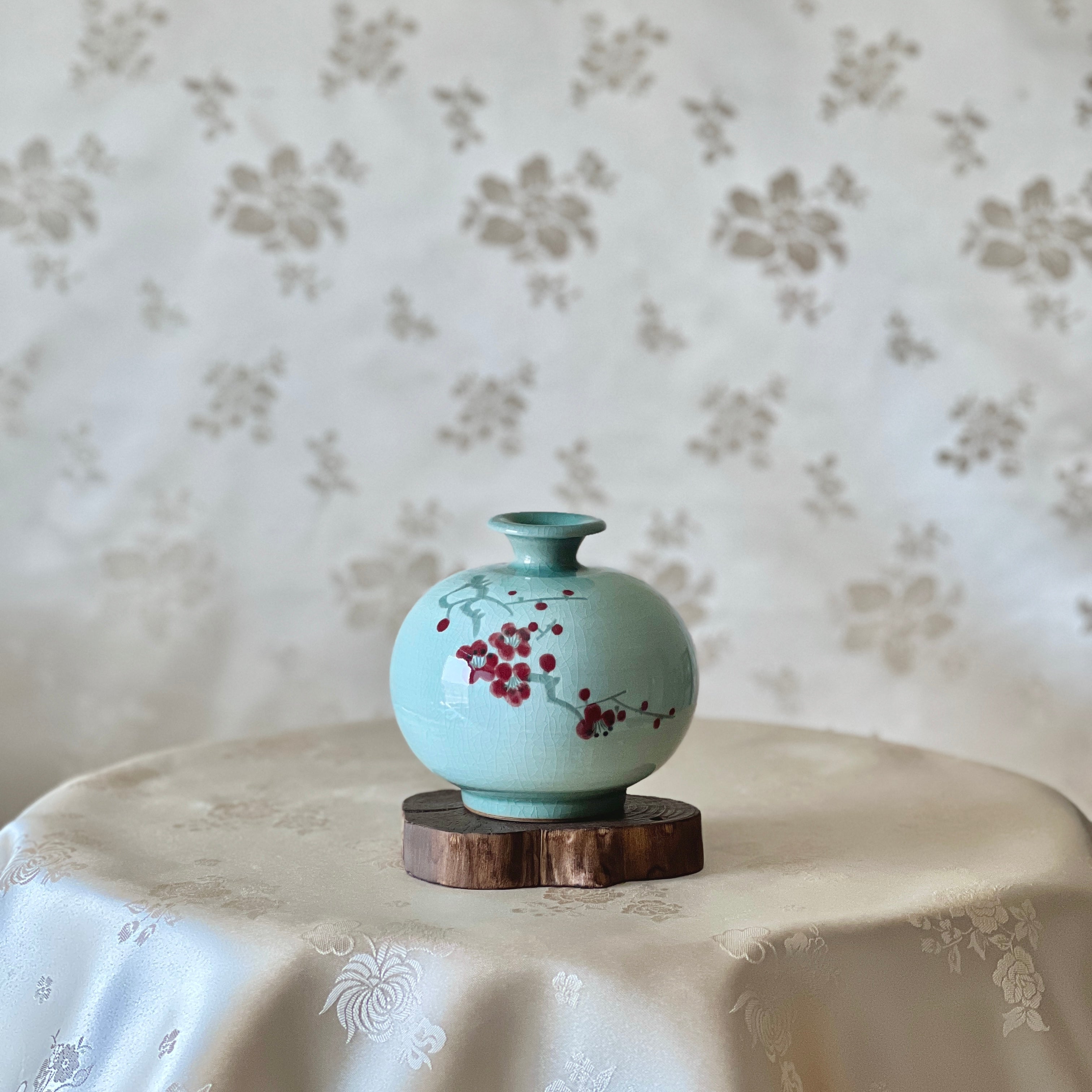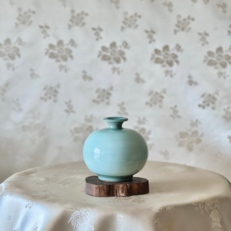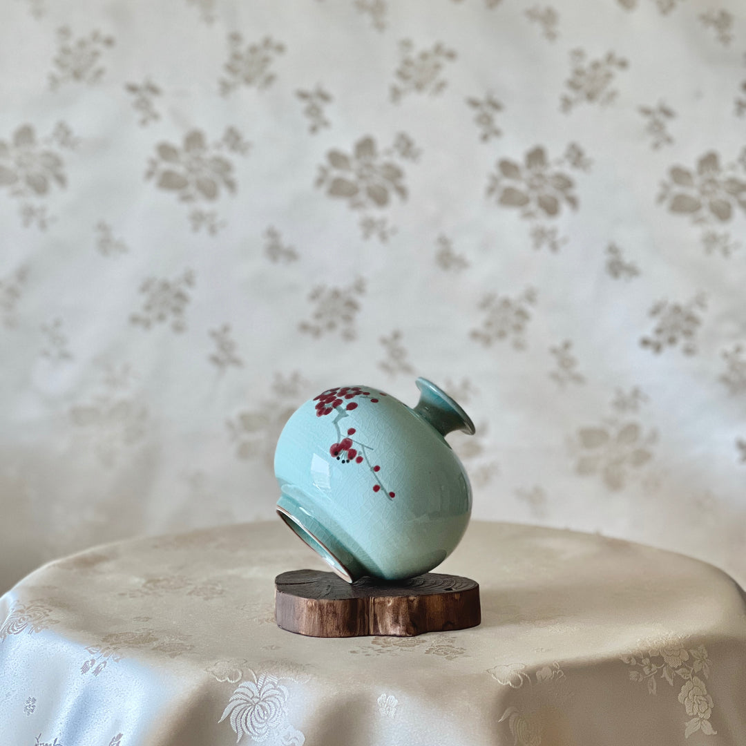 Experience the elegance of Korean craftsmanship with our Korean Traditional Handmade White Celadon Vase Set with Plum Blossom Pattern (청자 백상감 매화문 호 세트). This exquisite set features two beautifully crafted vases – one with a small mouth and the other with a wide mouth, perfectly harmonized to complement each other. The delicate plum blossom pattern adds a touch of nature’s beauty, making these vases a stunning addition to any room.